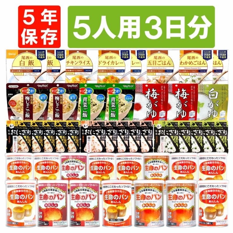 3. 5人用/3日分 45食 非常食セット 5年保存 アルファ米 パンの缶詰 5人分 3日間 生きのびる 防災食 防災 食品 缶入りパン 尾西 おにぎり ご飯 お米 保存食 防災セット 防災グッズ 災害備蓄用パン 生命のパン 防災用品
