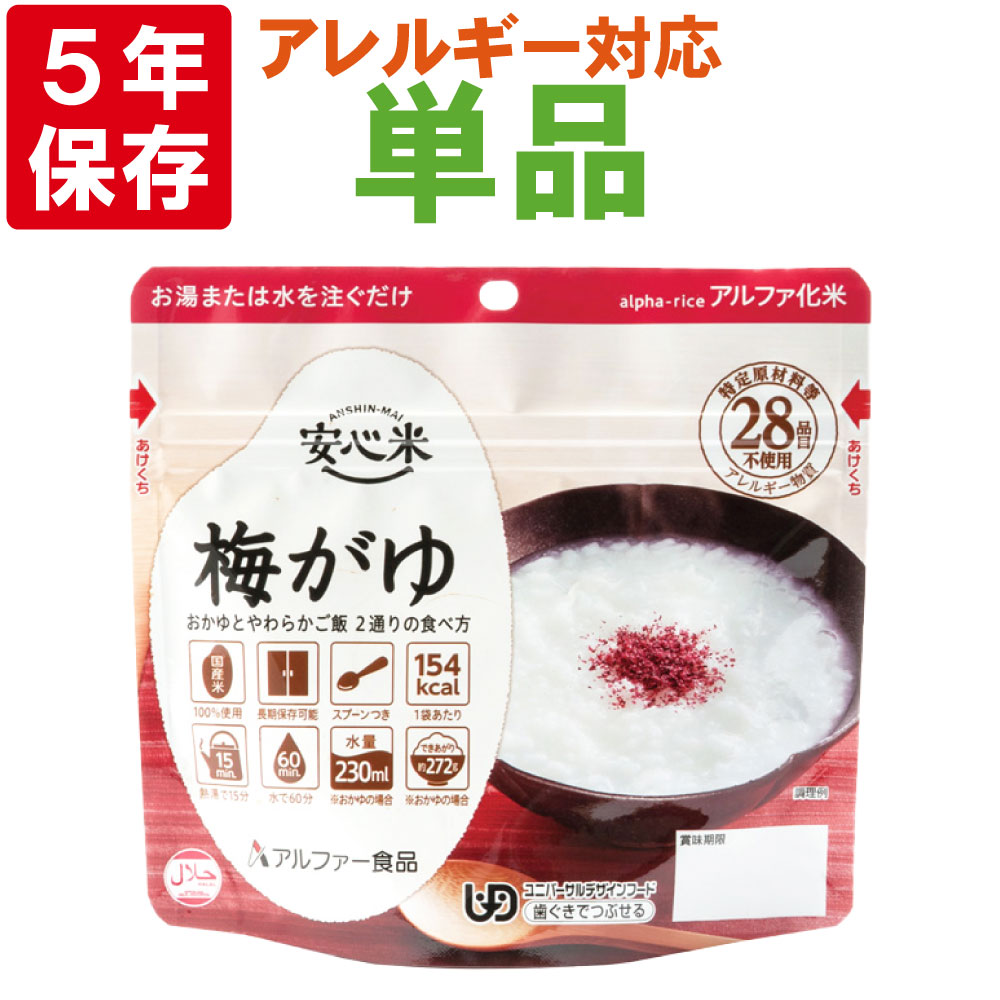 特定原材料等(アレルギー物質)28品目不使用、ハラール認証取得 非常食 アルファ米 安心米「梅がゆ」5年保存 食べ方2通り [メール便4個までOK]