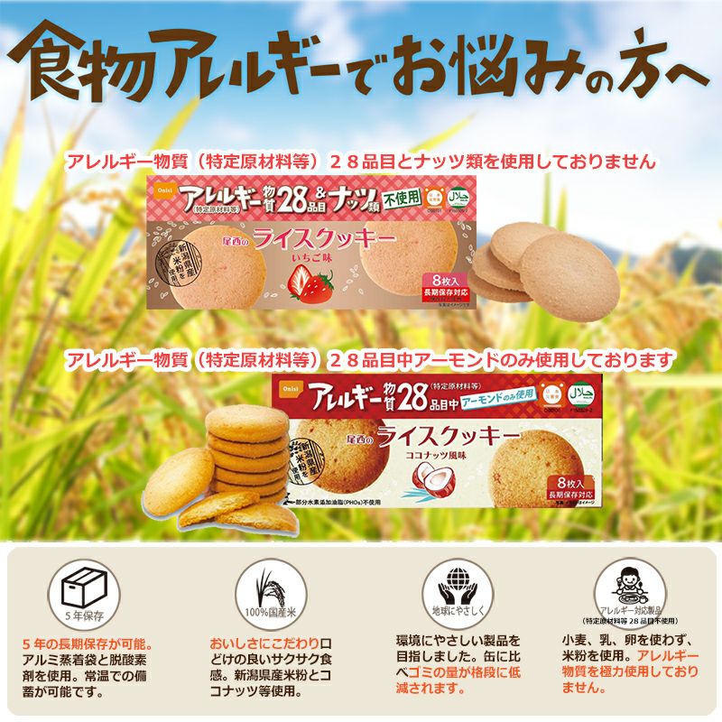 他の画像を見る 小麦、乳、卵を使わず、米粉を使用。アレルギー物質(特定原材料等)27品目不使用のクッキーです。常温での5年の長期保存が可能。 尾西のライスクッキー12箱セット5年保存食アレルギー物質27品目不使用 公式サイト特別価格 ¥ 3,570 税込 詳細を見る お気に入りに登録する