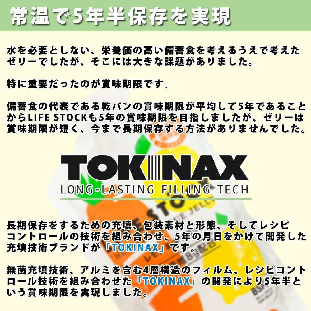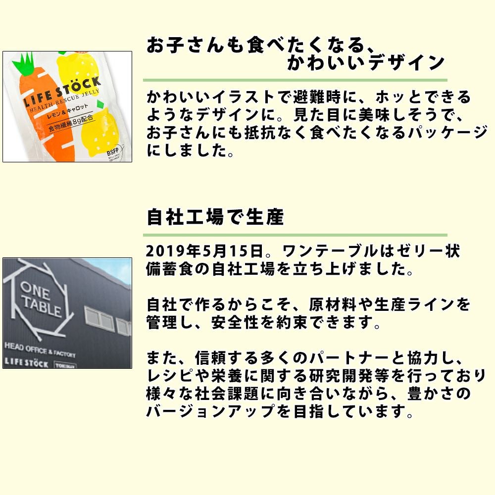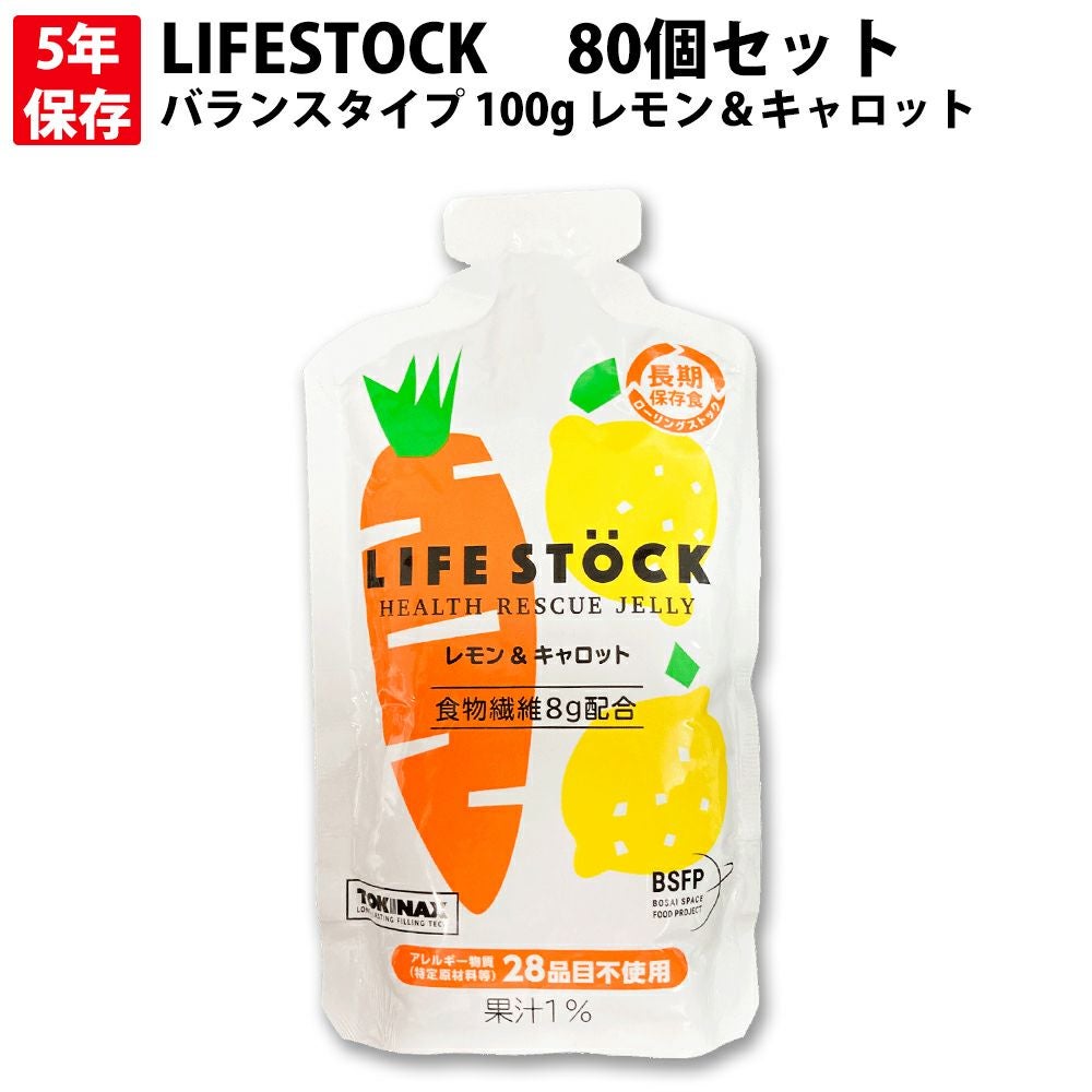 他の画像を見る 被災時もバランスの良い食生活を。 5年保存 非常食 防災備蓄用ゼリー LIFESTOCK (バランスタイプ 100g レモン&キャロット) アレルギー対応食(28品目) (メール便6個までOK) 公式サイト特別価格 ¥ 389 税込 詳細を見る お気に入りに登録する