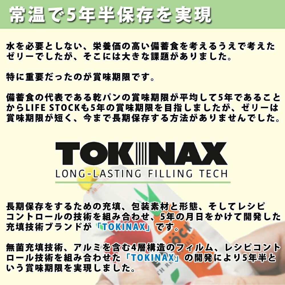 他の画像を見る 省スペース備蓄!200kcal/個以上。 5年保存 防災備蓄用ゼリー 80個セット/箱 LIFESTOCK (エナジータイプ 100g グレープ or 洋ナシ) アレルギー対応食(28品目) 公式サイト特別価格 ¥ 24,414 税込 詳細を見る お気に入りに登録する