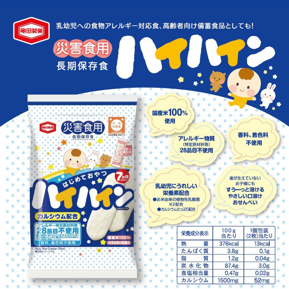 他の画像を見る すうーっと溶ける、やさしい口どけのおせんべい。歯が生えていないお子様や、高齢者向け備蓄食品として。 非常食 亀田製菓 災害食用ハイハイン 5年保存 24食セット 公式サイト特別価格 ¥ 6,124 税込 詳細を見る お気に入りに登録する