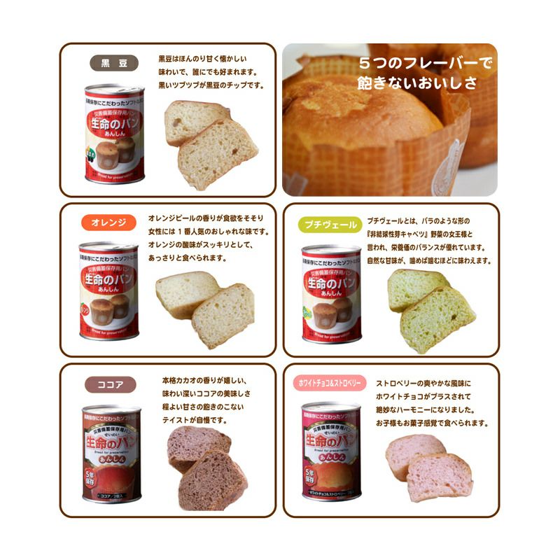 他の画像を見る オレンジ、黒豆、プチヴェール、ココア ホワイトチョコ&ストロベリーが各2缶の10缶セット バリエーション豊かな5種類の味、全てお届け。 【5年保存】生命のパン全5種類10缶コンプリートセット 公式サイト特別価格 ¥ 4,512 税込 詳細を見る お気に入りに登録する