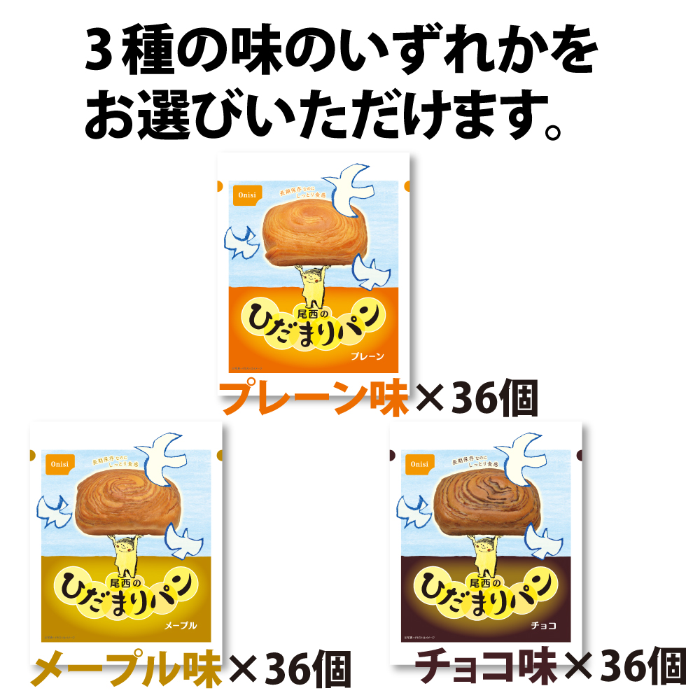 3. 5年保存 非常食「尾西のひだまりパン」選べる3種類(プレーン/メ ープル/チョコ) 36個/ケース