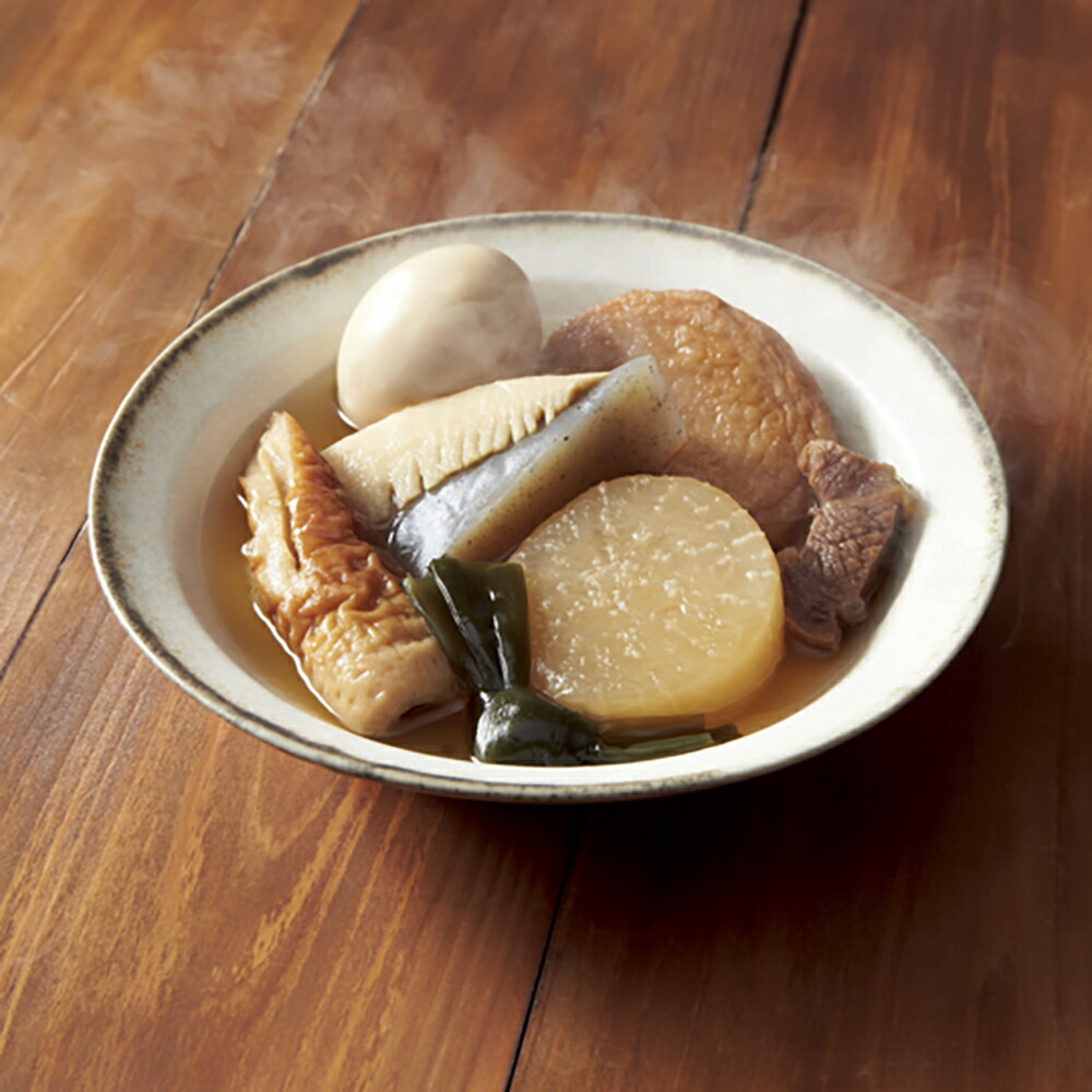 水煮大根、ゆで玉子、大判揚げ、こんにゃく、ちくわ、水煮たけのこ、牛すじ、結び昆布、 おでん汁の素(しょうゆ、食塩、ぶどう糖果糖液糖、かつおエキス、煮干、野菜エキス、たん白加水分解物、かつお節、さば節、昆布エキス)、水あめ、かつおエキス/ソルビトール、加工でんぷん、調味料(アミノ酸等)、水酸化Ca、酸化防止剤(V.E)、V.C、(一部に卵・小麦・牛肉・さば・大豆を含む)