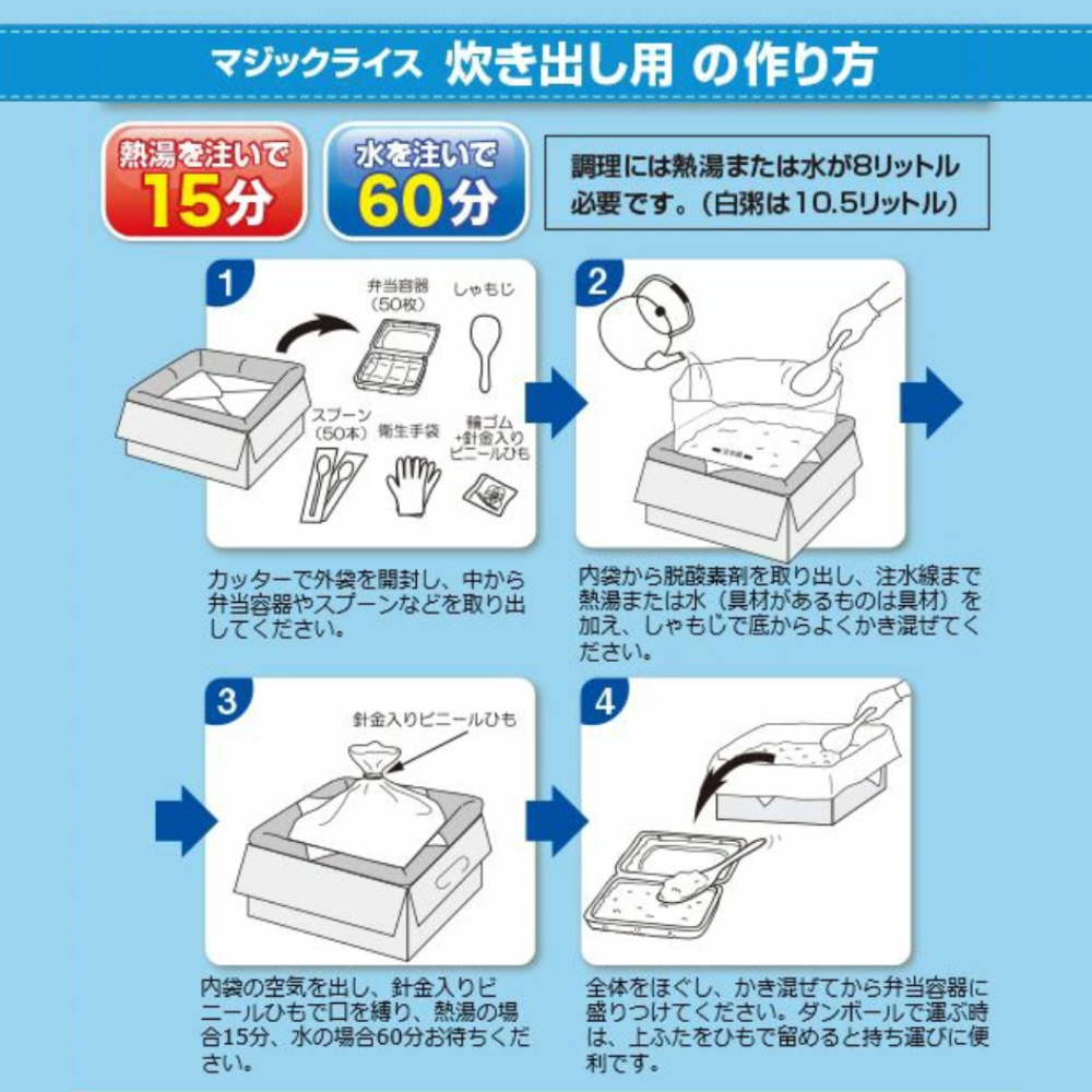 50食分のご飯が、15分でできあがる、「マジックライス」の炊き出しセットです。