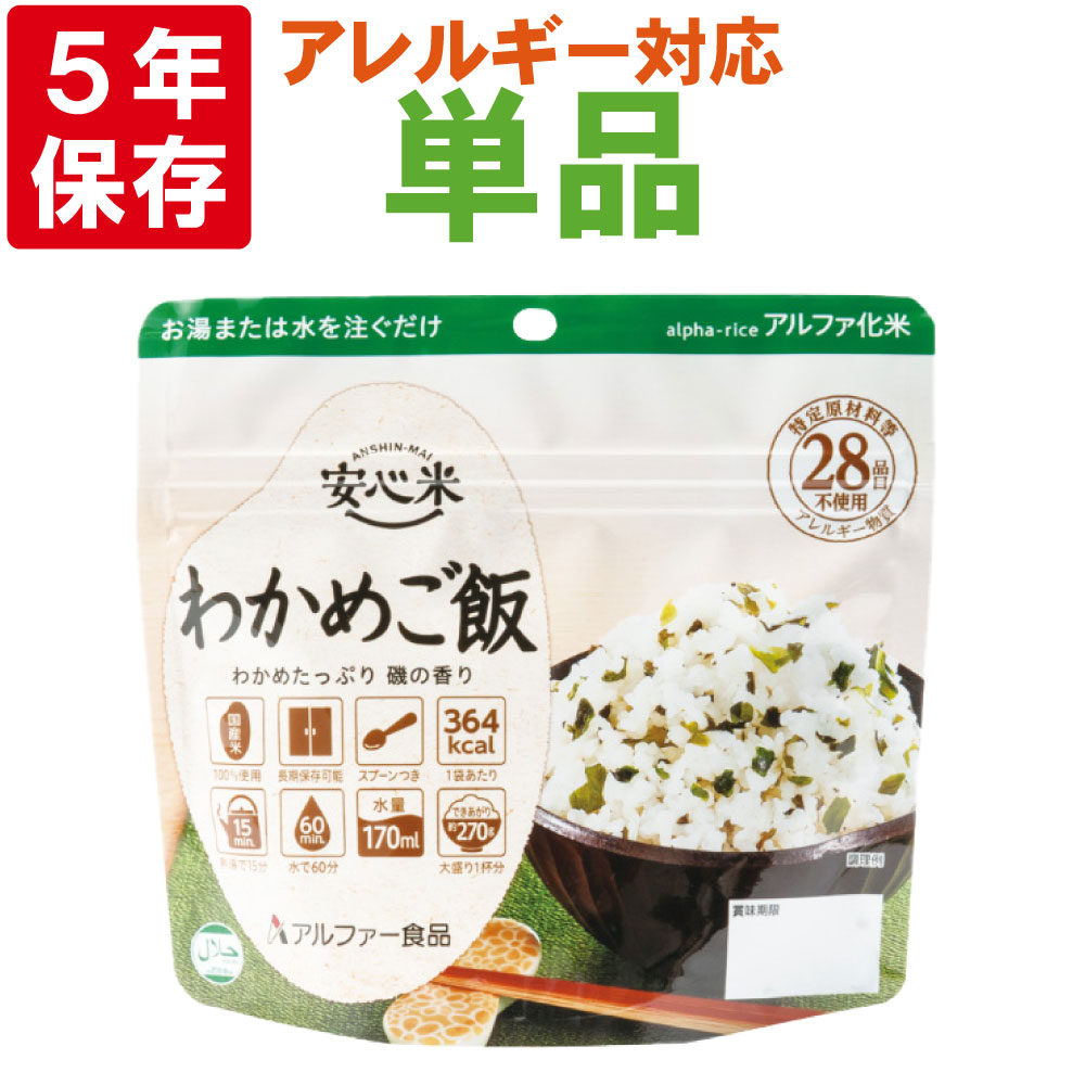 特定原材料等(アレルギー物質)28品目不使用、ハラール認証取得 非常食 アルファ米 安心米「わかめご飯」5年保存 国産米100% [メール便4個までOK]