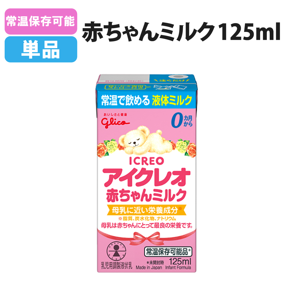 母乳に近い栄養成分、常温で飲める液体ミルク。 常温保存可能 液体ミルク アイクレオ 赤ちゃんミルク125ml 単品 地震 災害 赤ちゃん 哺乳瓶 乳幼児用 ベビー 防災 清潔 安全 保存料不使用