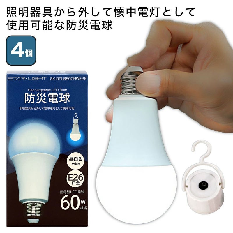 3. 防災グッズ 防災電球 4個 STAR LIGHT PSE認証 蓄電型 LED 電球 60W相当 昼白色 E26口金 消費電力9W フック付ソケット付 懐中電灯 SK-DPLB800NWE26 星光商事