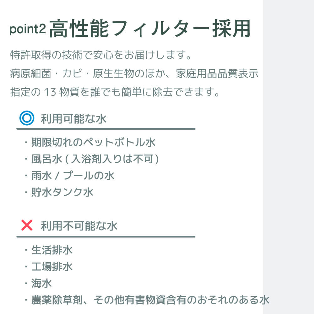 「コッくん飲めるゾウスリム」は高性能フィルターにより、病原細菌(大腸菌、コレラ菌、バクテリア、チフス、インフルエンザなど)、カビ、原生動物(エキノコックスなど)や、「家庭用品品質表示」に定められた13物質を除去し、安心して飲めるキレイな水に誰でも簡単に浄水できます。