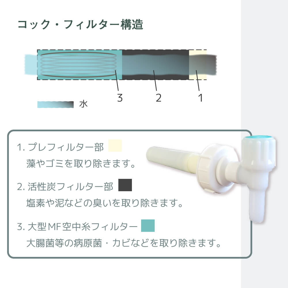 ・高性能フィルターで、大腸菌、一般細菌、臭いなどを除去します。