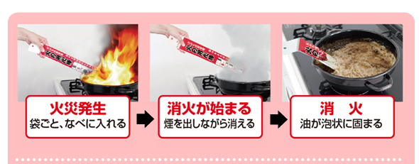 消火剤を包んでいる特殊ビニールが熱で破れ、わずか3~5秒で、油が泡状に固まって消火!