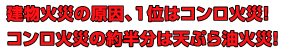 家庭内で起きる火災のうち、コンロ火災の割合が増加しており、その半数は『天ぷら油の発火』によるものです。