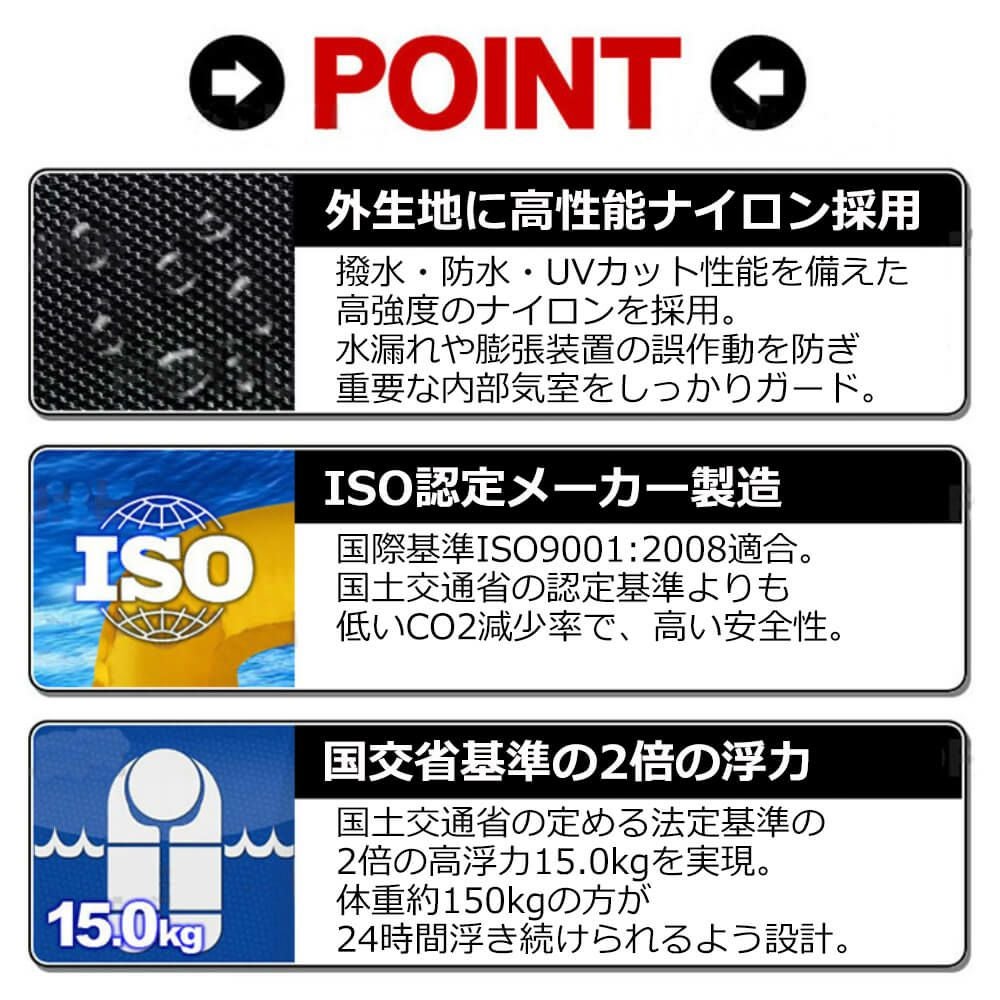 他の画像を見る CE・CCS規格ダブル認定 国際安全規格取得品!国土交通省基準より浮力UP(気室150N超え) 【最新モデル】ライフジャケット ベストタイプ(自動膨張式) 公式サイト特別価格 ¥ 7,495 税込 詳細を見る お気に入りに登録する