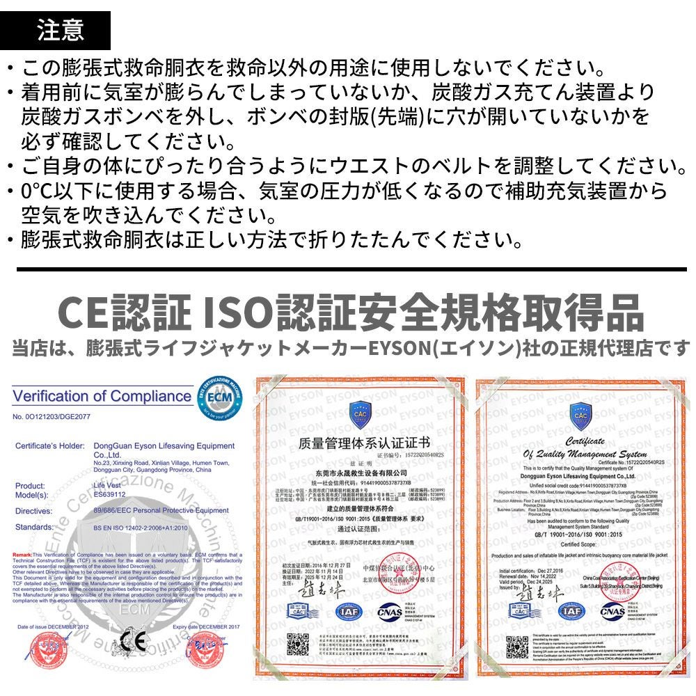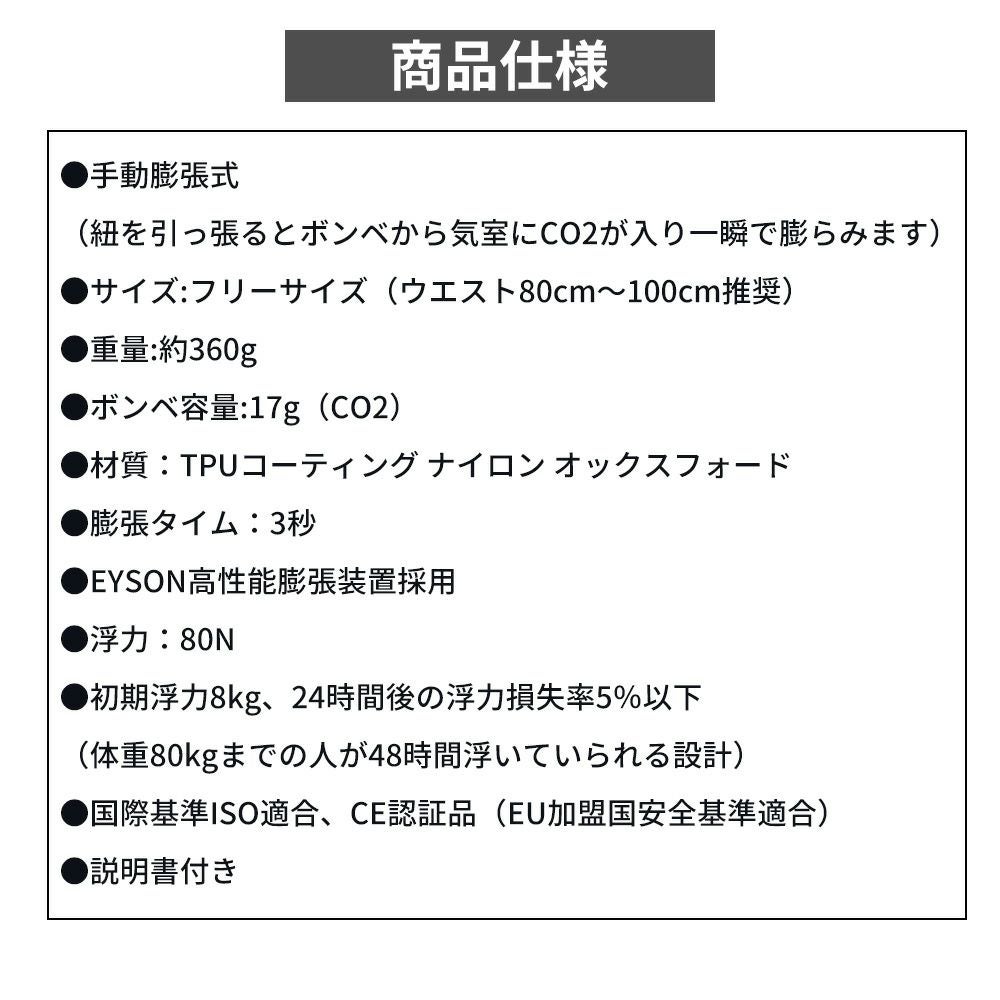 他の画像を見る CE認証EU加盟国安全基準適合)・ISO認証安全規格取得品!ライフジャケット ベルトタイプ 自動膨張式! ライフジャケット ウエスト ベルトタイプ(自動膨張式) 公式サイト特別価格 ¥ 5,215 税込 詳細を見る お気に入りに登録する