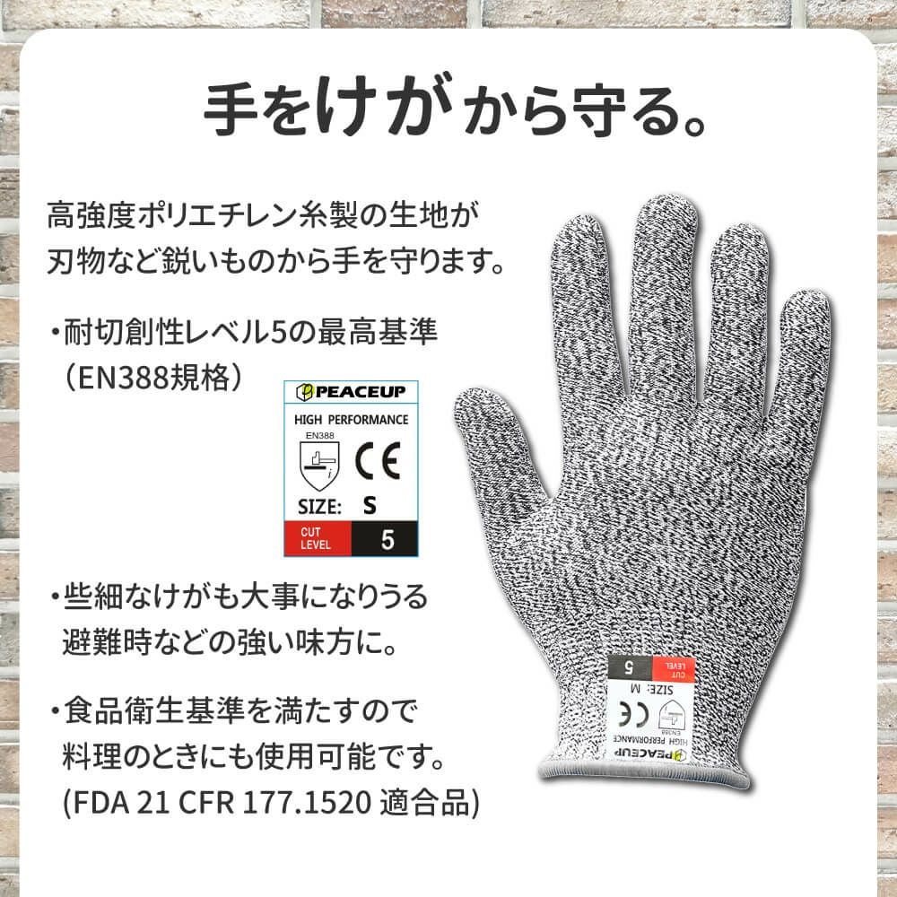 他の画像を見る 切れない破れない 耐切創レベル5 食品安全基準適合 男女兼用 防災士推奨 FDA食品安全基準適合防災グッズ 耐切創手袋 S/M/L/XL 2双セット PEACEUP 防刃グローブ メール便2個まで 公式サイト特別価格 ¥ 1,215 税込 詳細を見る お気に入りに登録する