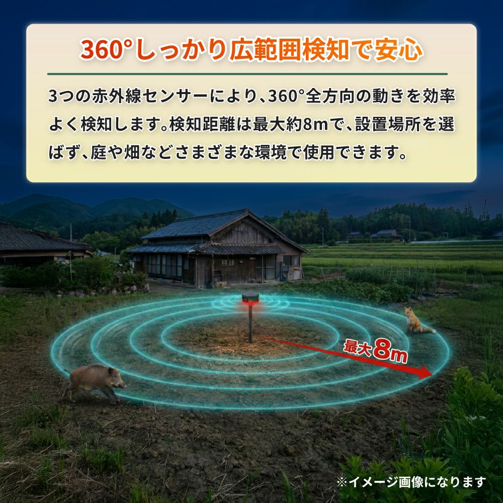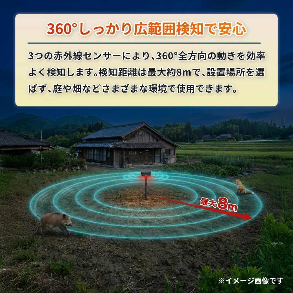 他の画像を見る 人や動物の動きを感知して約130dBの大音量と光で警戒するソーラー式赤外線アラーム。録音機能とリモコン操作に対応し、防犯・防獣対策に活躍します。 高感度赤外線搭載ソーラーアラーム 1個 防犯アラーム 人感センサー ソーラー 防獣 防犯 害獣撃退器 警報器 アラーム リモコン 防水 録音 ライト 屋外 熊 猪 熊対策 熊よけ 赤外線 SSA02 EVERSAFE 公式サイト特別価格 ¥ 3,599 税込 詳細を見る お気に入りに登録する