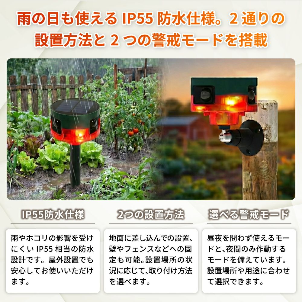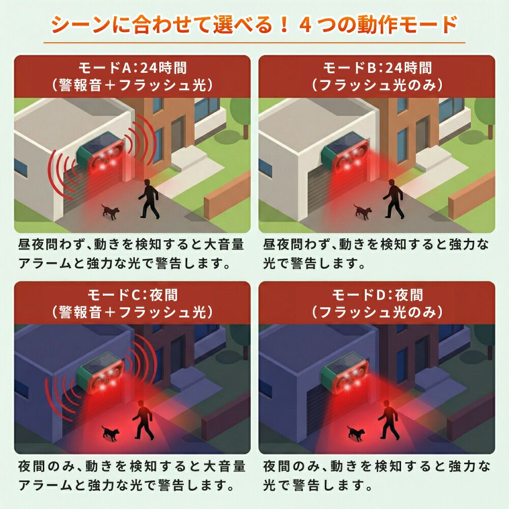 他の画像を見る 人や動物の動きを感知して音と光で警戒するソーラー式赤外線アラーム。録音機能とリモコン操作に対応し、防犯・防獣対策に幅広く活躍します。 防犯アラーム ソーラー赤外線センサーアラーム 1個 人感センサー ソーラー 防獣 防犯 害獣撃退器 警報器 アラーム リモコン SSA01 EVERSAFE 公式サイト特別価格 ¥ 3,780 税込 詳細を見る お気に入りに登録する