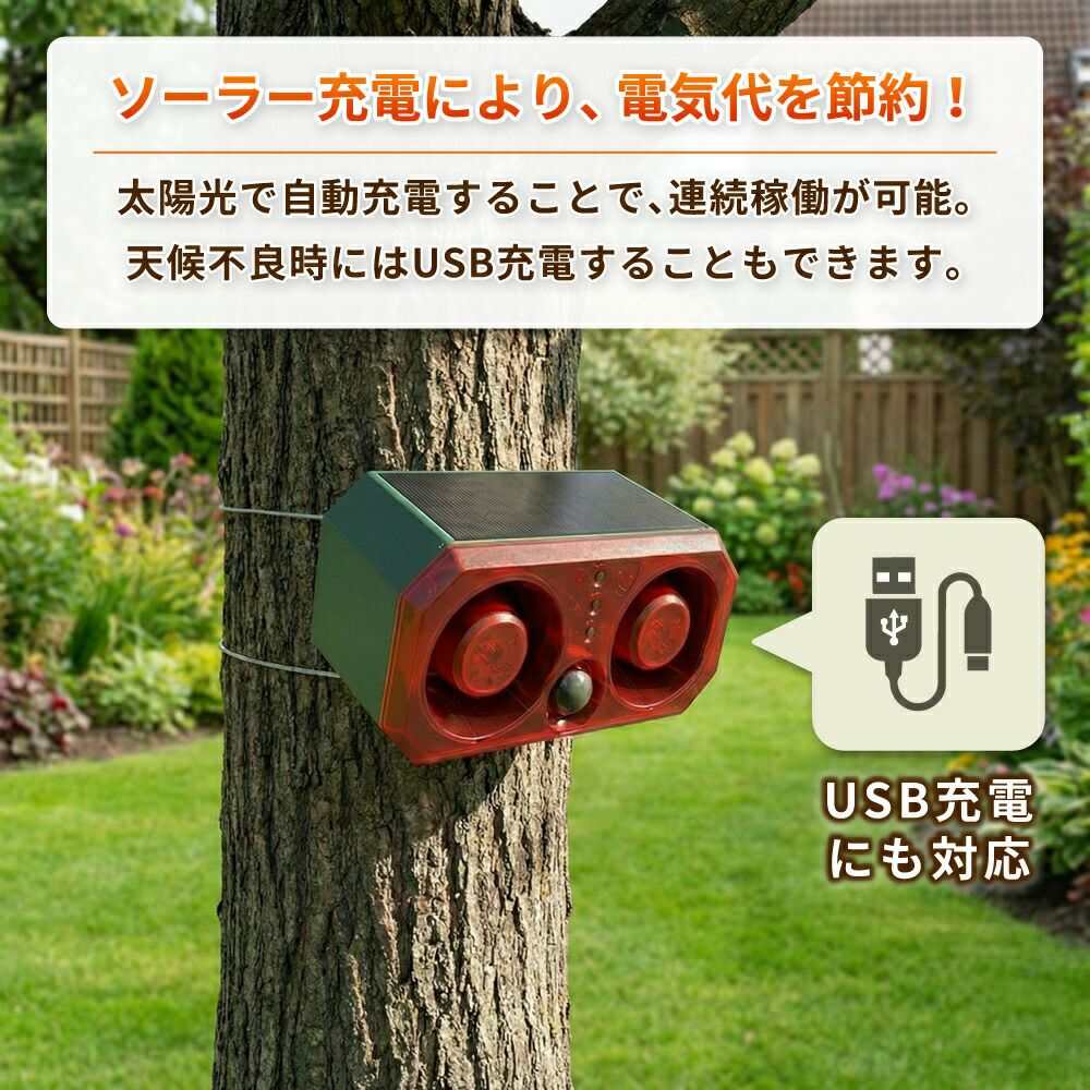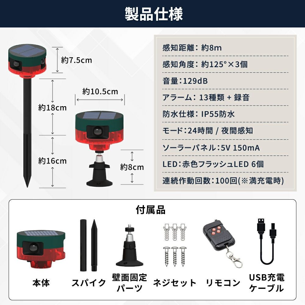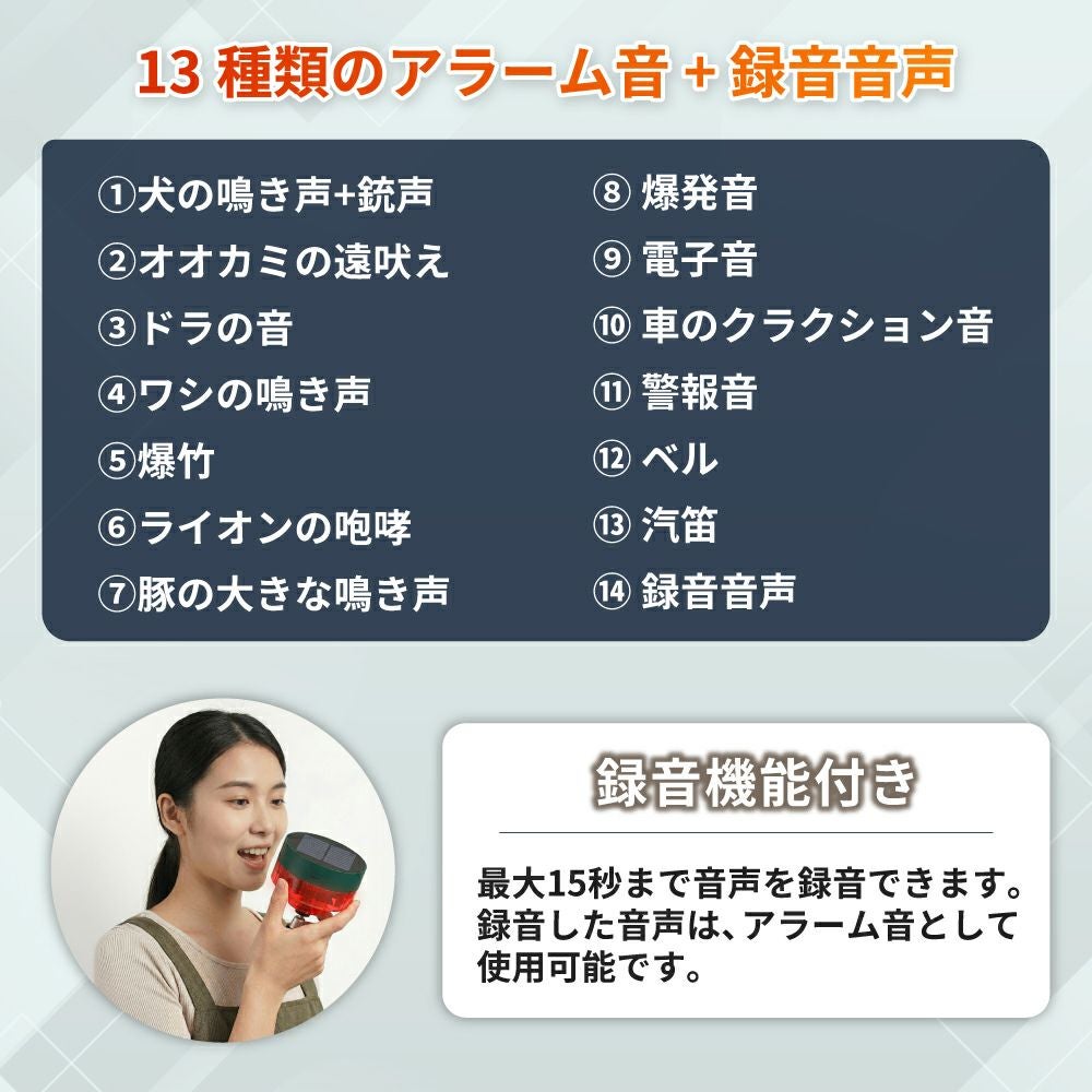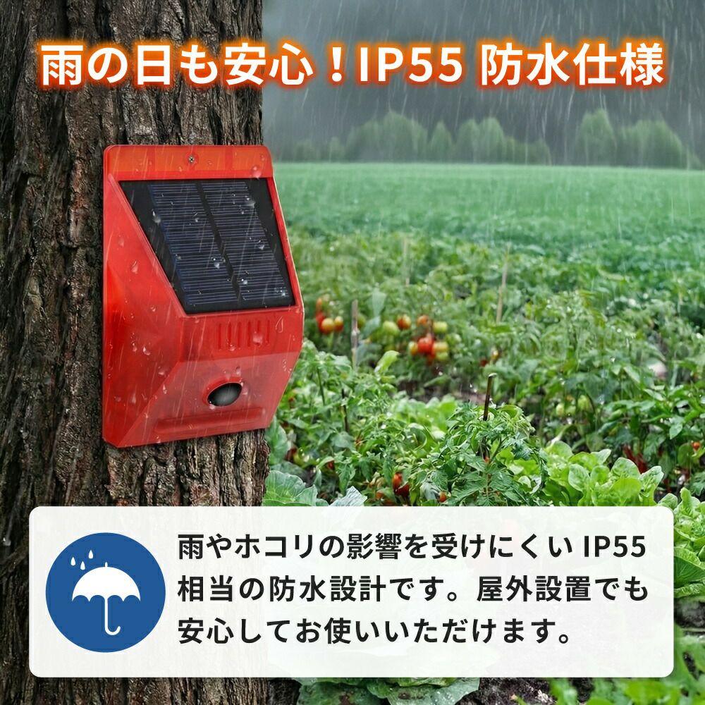 他の画像を見る 人や動物の動きを感知して約130dBの大音量と光で警戒するソーラー式赤外線アラーム。録音機能とリモコン操作に対応し、防犯・防獣対策に活躍します。 高感度赤外線搭載ソーラーアラーム 2個 防犯アラーム 人感センサー ソーラー 防獣 防犯 害獣撃退器 警報器 アラーム リモコン 防水 録音 ライト 屋外 熊 猪 熊対策 熊よけ 赤外線 SSA02 EVERSAFE 公式サイト特別価格 ¥ 6,725 税込 詳細を見る お気に入りに登録する
