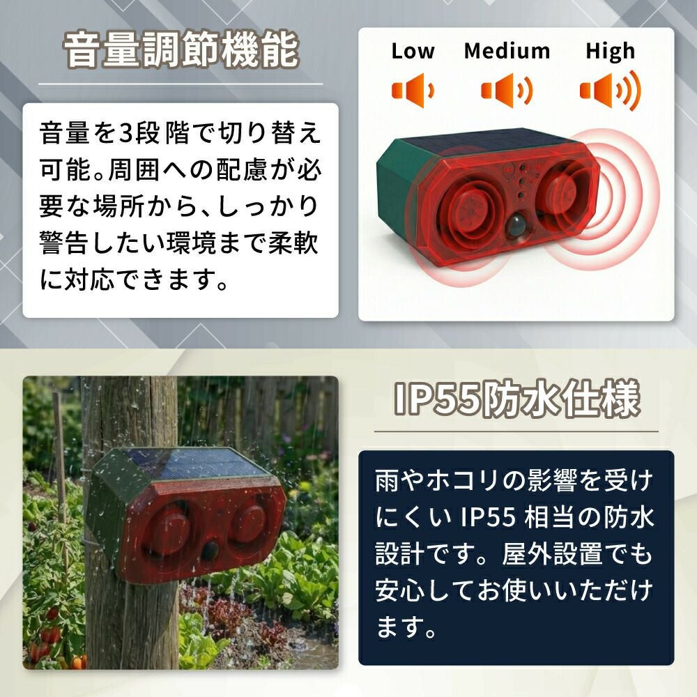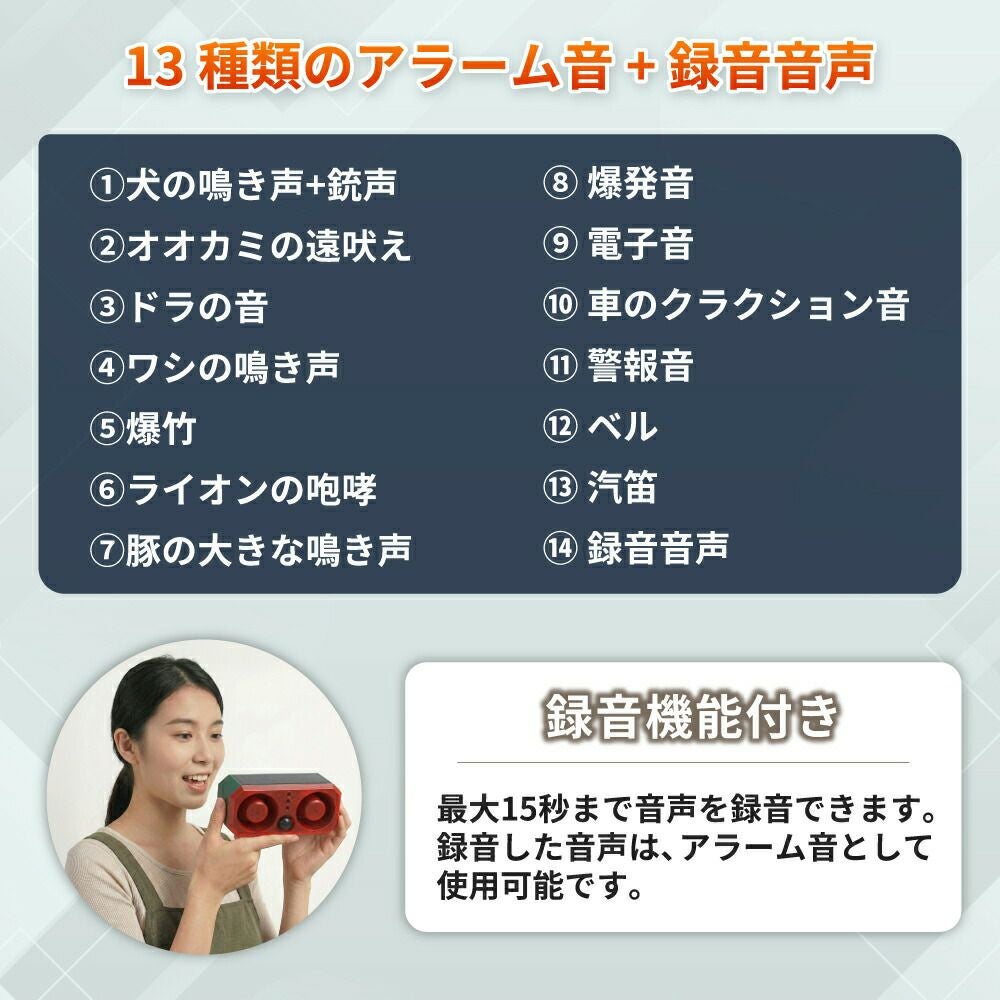 他の画像を見る 人や動物の動きを感知して約130dBの大音量と光で警戒するソーラー式赤外線アラーム。録音機能とリモコン操作に対応し、防犯・防獣対策に活躍します。 高感度赤外線搭載ソーラーアラーム 4個 防犯アラーム 人感センサー ソーラー 防獣 防犯 害獣撃退器 警報器 アラーム リモコン 防水 録音 ライト 屋外 熊 猪 熊対策 熊よけ 赤外線 SSA02 EVERSAFE 公式サイト特別価格 ¥ 12,540 税込 詳細を見る お気に入りに登録する