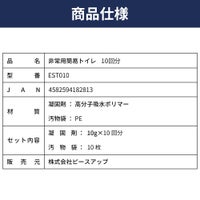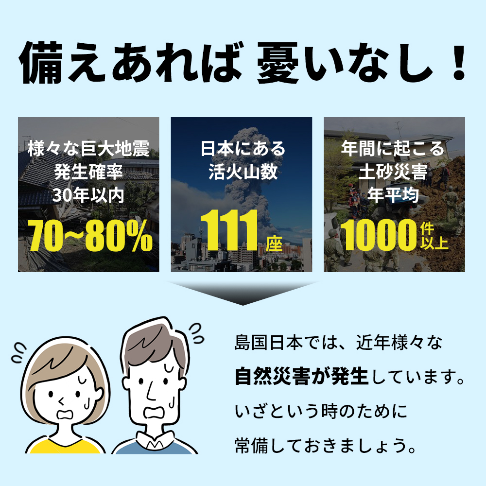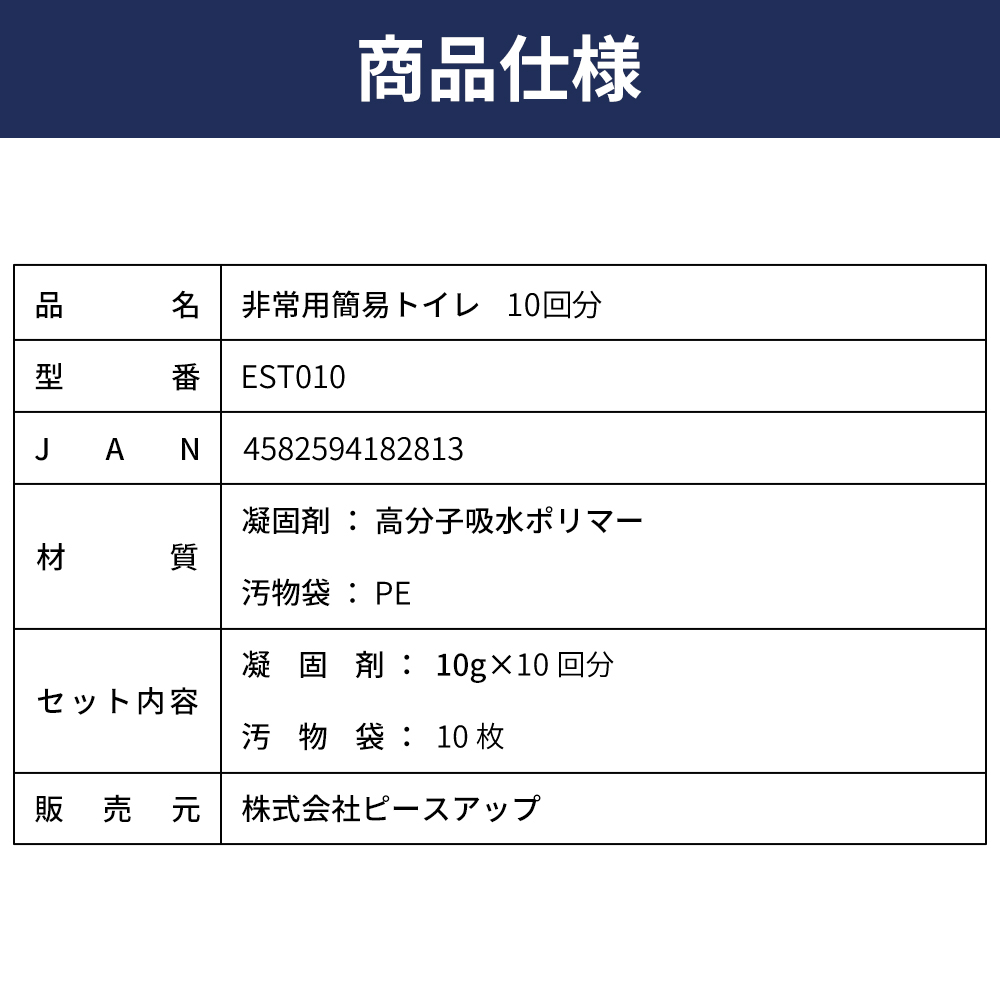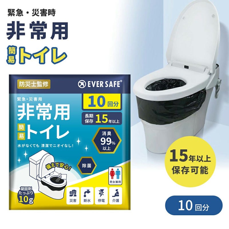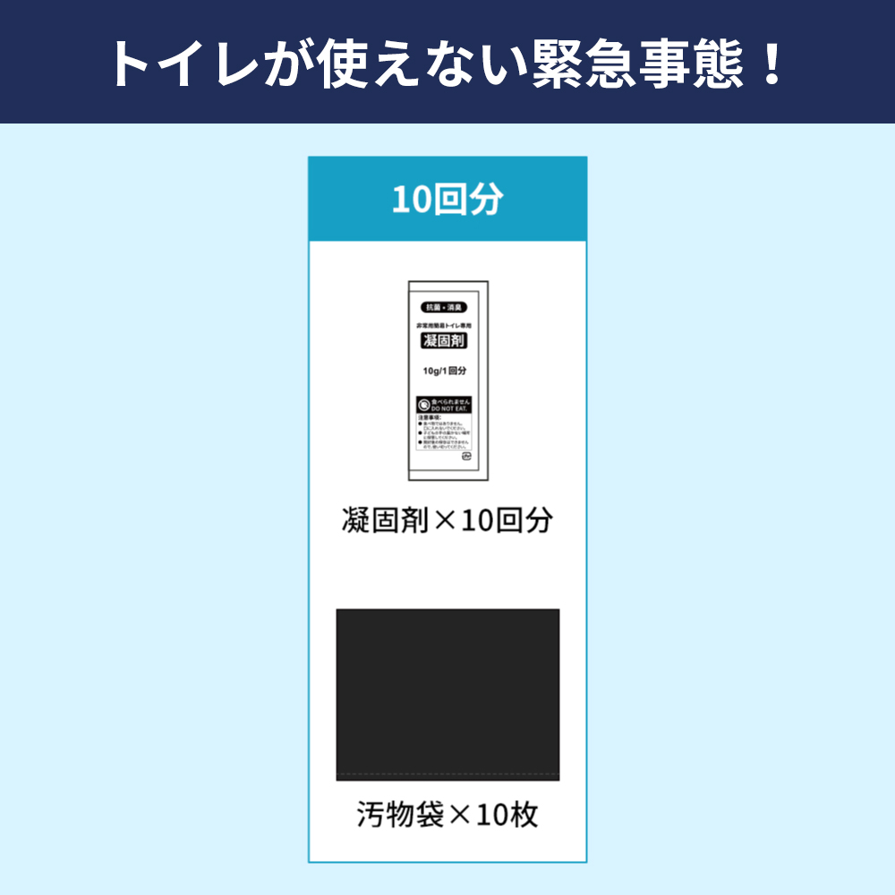 消臭・抗菌 大容量 コンパクトサイズ 半永久保存 災害時のトイレ問題をこれで解決!! 災害時の断水や停電時などでトイレが使えなくなったとき必ず役に立つ防災用品の一つです。 【商品特徴】 ●緊急・災害時 非常用 簡易トイレ 水がなくても清潔でニオイなし ●凝固剤10g使用 しっかり吸収 ●組み立てなどは一切なし、取り出してすぐに使える ●他に用意するものは無く、必要なものだけをセット ●15年以上の長期保管OK! ●特殊フィルムパッケージを使用した凝固剤なので長期保管が実現 【使用シーン】 断水時に 災害時に トイレの故障時に 感染症等の嘔吐に 車での長距離移動に 介護に 【使用方法】 1.便器に汚物袋(黒)を被せ、袋を挟むように便座を下ろして固定します。 2.ご使用後、凝固剤を振りかけます。 3.汚物袋を取り外し、口を結びます。 4.ごみ袋は固く結んで各自治体の指示に従って廃棄してください。 【セット内容】 〈10回分〉 凝固剤×10回分 汚物袋×10枚 【注意事項】 ●凝固剤は直接便器の中や、 排水口に入れないでください。 固まってつまる原因となります。 ●凝固剤は誤って飲み込まないよう、 子供の手の届かないところに保管してください。 ●万が一凝固剤を飲み込んでしまった場合、水で口の中をすすぎ、コップ1、2杯の水または牛乳を飲み、ただちに医師の診断を受けてください。 ●凝固剤が皮膚に付着した場合、速やかに水で流してください。 ●直射日光射が当たる場所もしくは湿気の多い場所での保管は避けてください。 ●凝固剤が目に入った場合は、すぐに水またはぬるま湯で洗い、直ちに眼科医に相談してください。 ●水分がないと固まりませんのでご注意ください。 ●固める粉はトイレ、洗面所などへ流さないでください。配水管が詰まる原因となります。 ●食事やお薬などの影響で、尿が凝固しづらい場合があります。その場合は凝固剤を多めに投入してください。 ●使用後の袋は、鋭利なものに接触しないようにしてください。 ●廃棄の際は、各自治体の規則に従ってください。 製造国:中国