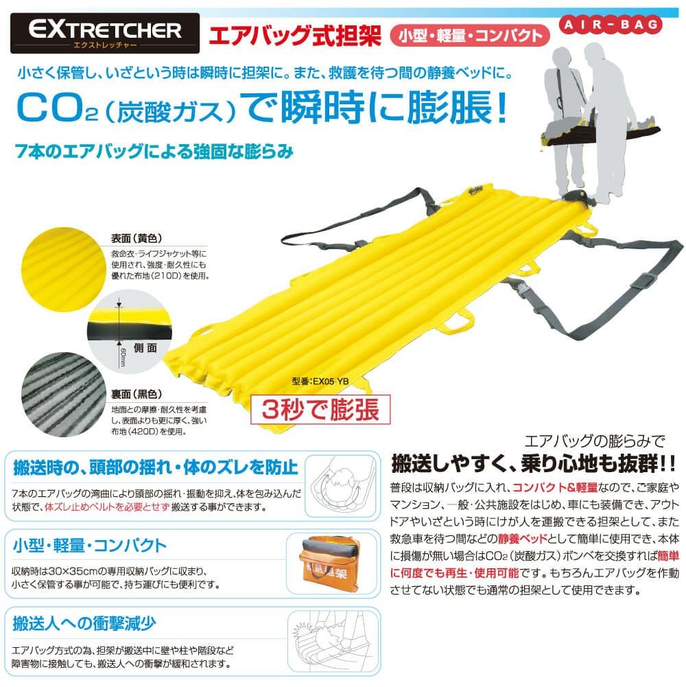 他の画像を見る 約3秒で膨らむ、エアバック方式!搬送しやすく、乗り心地も抜群 エアバッグ式担架 エクストレッチャーS 交換用ボンベ CO2(炭酸ガス) 公式サイト特別価格 ¥ 3,135 税込 詳細を見る お気に入りに登録する