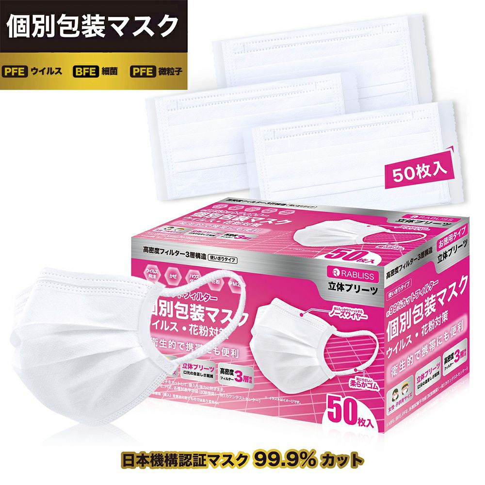 他の画像を見る 階段プリーツ 日本機構認証 BFE VFE PFE 99%cut CE・FDA RABLISS 個包装マスク 女性・子供用 50枚入 公式サイト特別価格 ¥ 479 税込 詳細を見る お気に入りに登録する