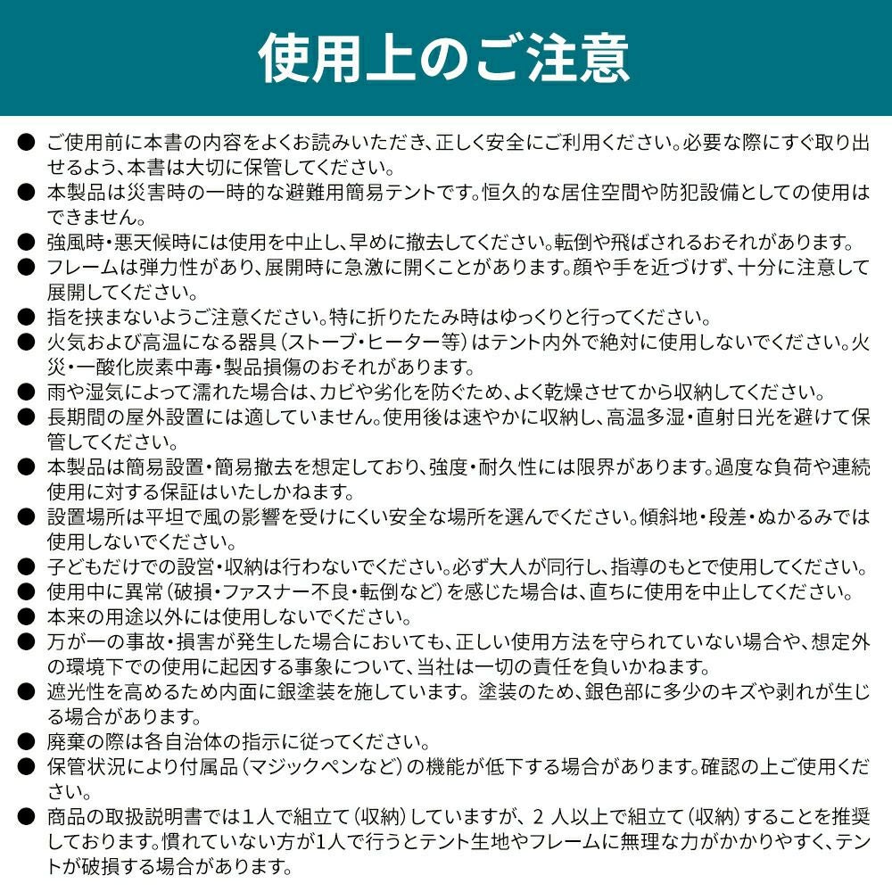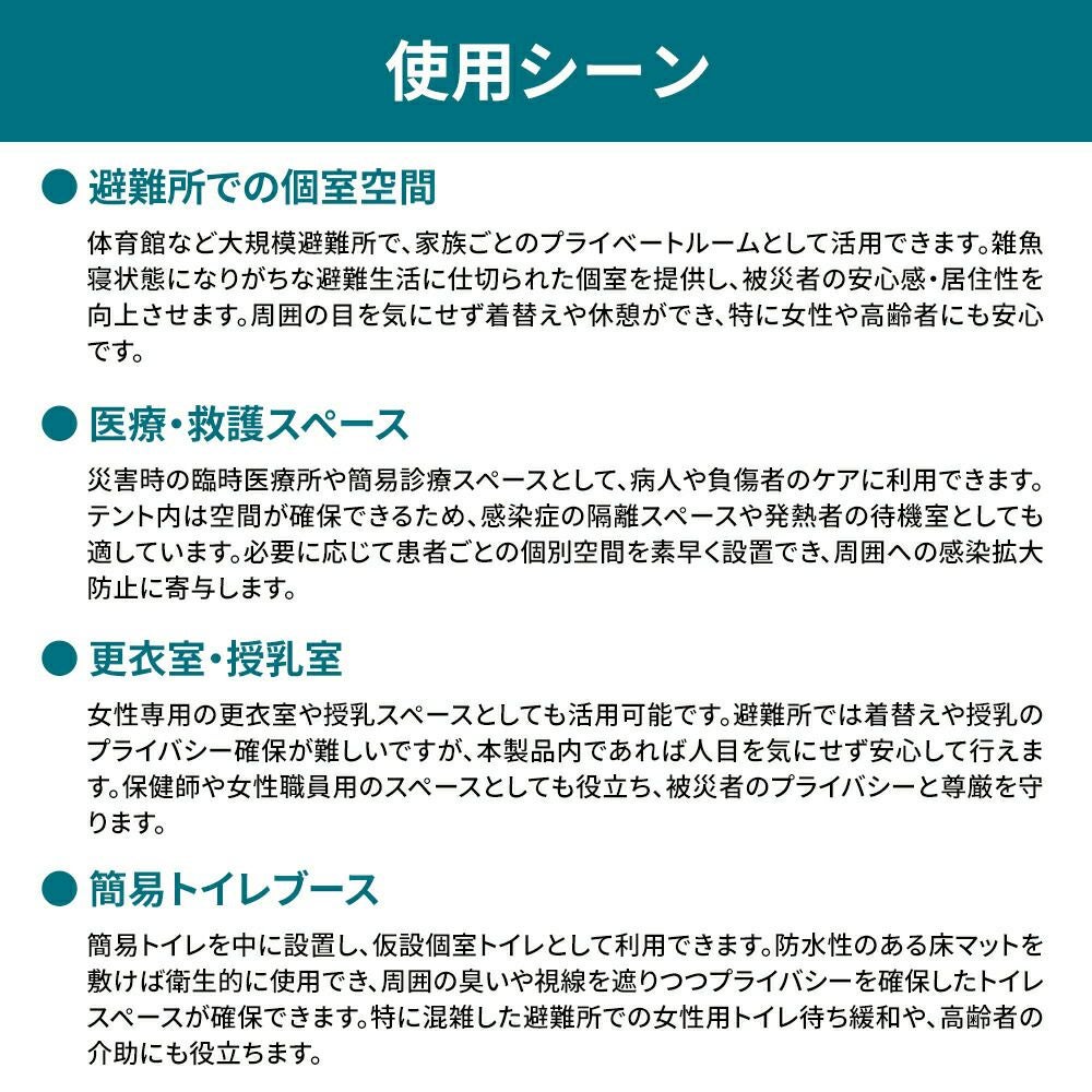 他の画像を見る プライバシーと通気性を両立した、安心できる避難所空間の実現 避難所での快適な生活を支える、使いやすく機能的な設計 防災用 避難個室テント 180 4個 防災グッズ シェルターテント プライバシー ファミリー 大型 軽量 パーティション 災害時 避難所 屋内 屋外 持ち運び コンパクト 抗菌 防水 UVカット 寒さ対策 車椅子 KO395 RABLISS 公式サイト特別価格 ¥ 129,580 税込 詳細を見る お気に入りに登録する