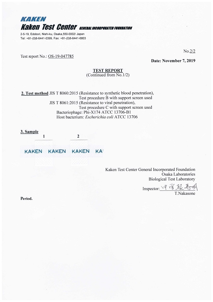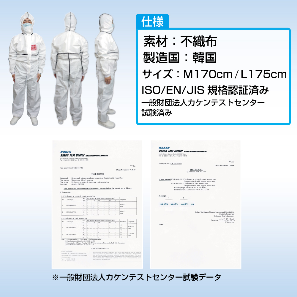 カケンテストセンター試験クラス6 JIS・ISO・EN 国際基準合格品 防護服 ウイルスバリア性能クラス6・血液バリア性能クラス6 国際基準合格品 Stump sp-2020