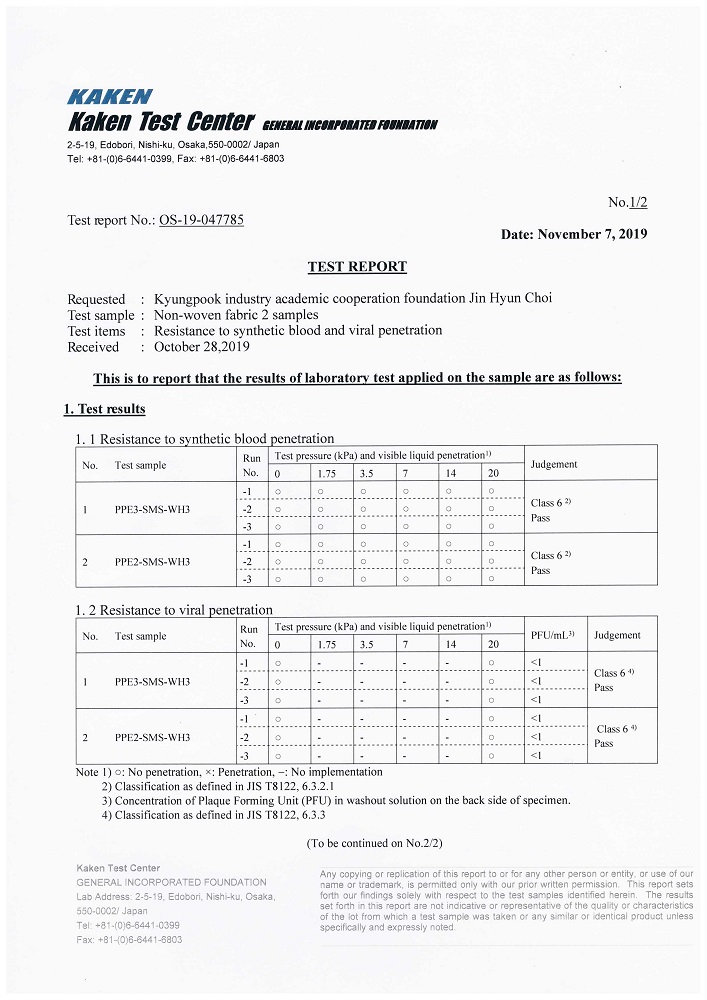 血液バリア性能クラス6(JIS T8060合格)