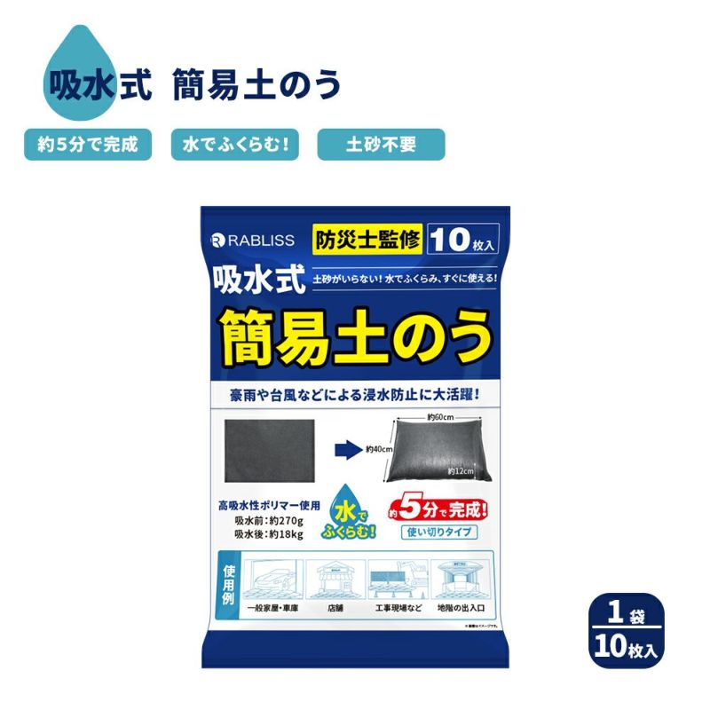 土のう 緊急簡易土のう 1袋(10枚入) 土嚢 簡易土嚢 水で膨らむ 吸水式 土のいらない 土不要 約5分で膨らむ 吸水性ポリマー 災害 水害 浸水 大雨 台風 洪水 防災グッズ 長期保存 破れにくい 黒 使い捨て 一般ゴミ 約5分で膨らむ KO375