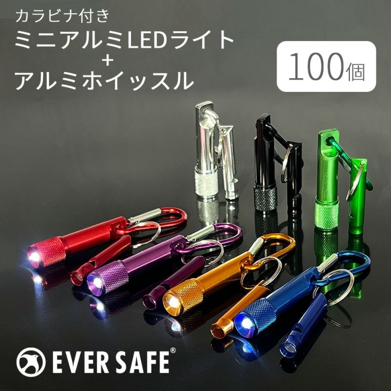 ミニライト カラビナ付 ミニアルミLEDライト&ホイッスル 100個 笛 LED 緊急避難 救助信号 災害 防災グッズ 小型軽量 防災セット EVERSAFE