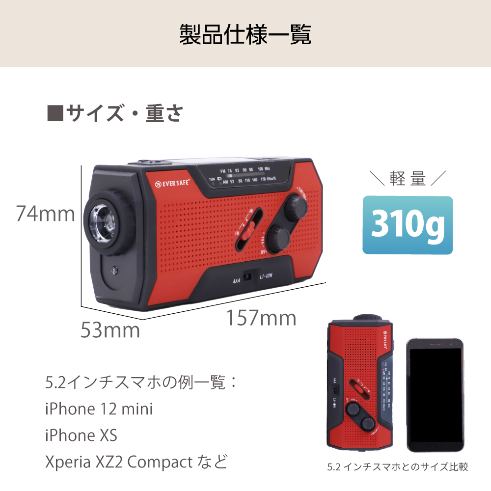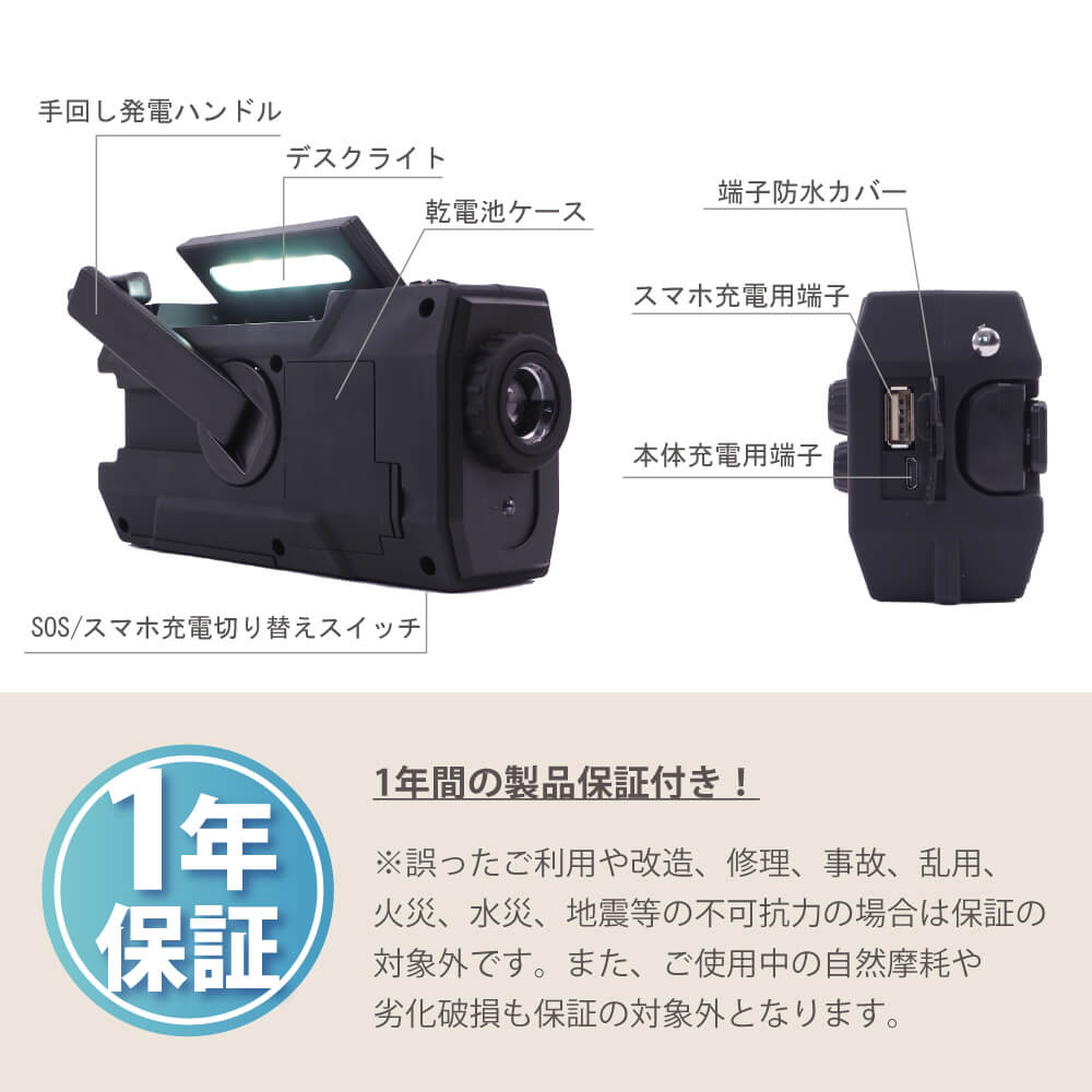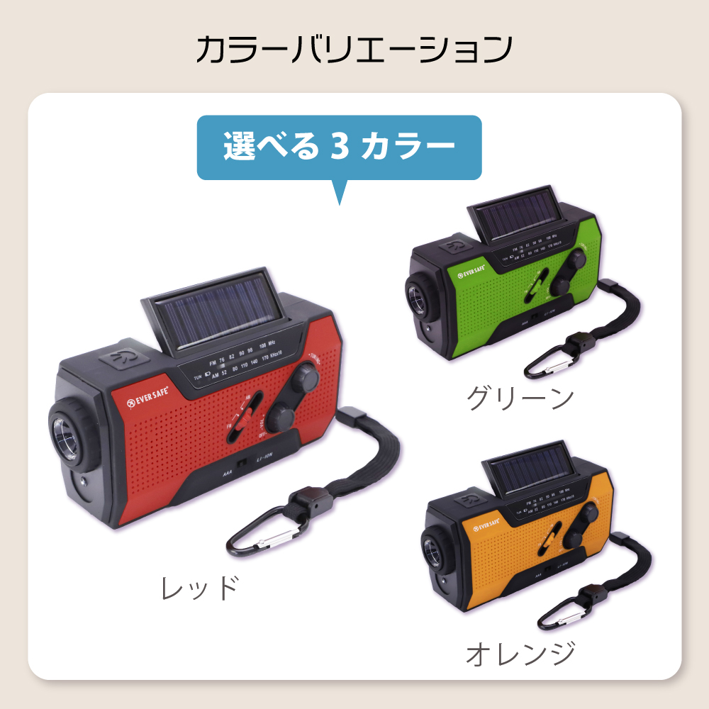 上記の照明・バッテリー・ラジオなどがありますが、それを一つに纏めた多機能防災ラジオがあり、その上軽量かつ、小さめの商品があり持ち運びもしやすく、防災リュックに入れてもスペースを取ることがありません。手回し発電(ダイナモ発電)は電池切れた上に乾電池がない場合、多機能ラジオに付いている手回し発電の機能でラジオが聞けるようになります、またソーラーパネル付きの多機能ラジオもあり、晴天時にラジオを充電することが可能です。