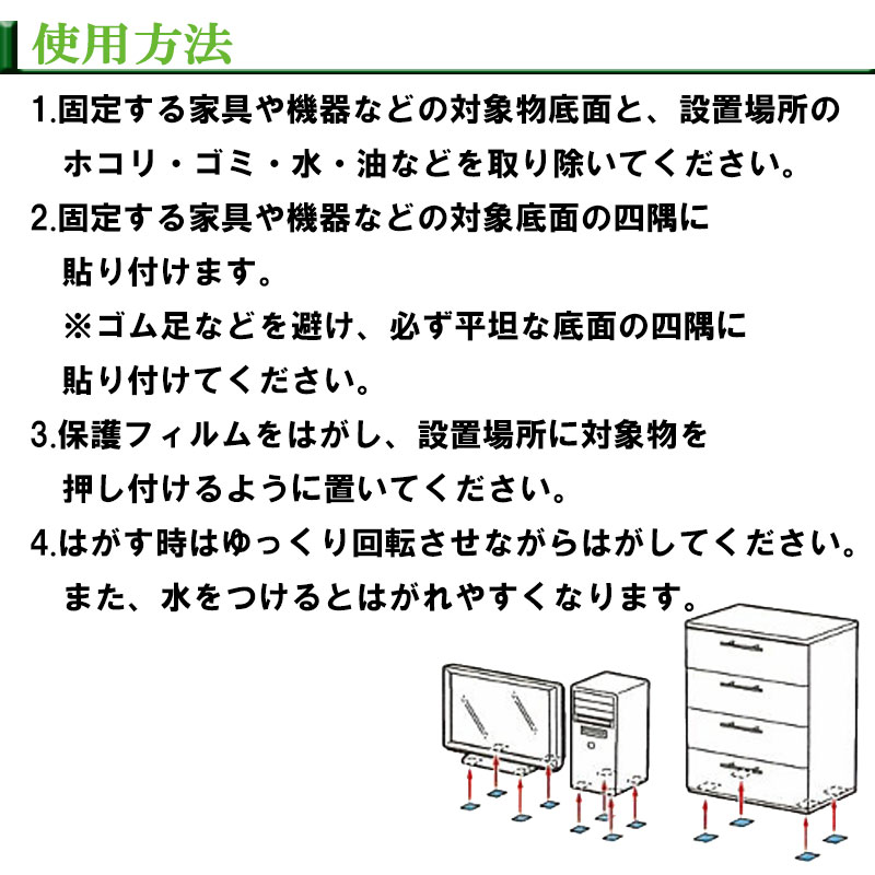 優れた粘着性により、大切な家具・置物などの底面に張るだけで