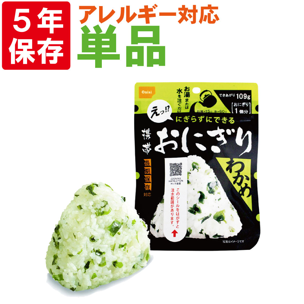 軽量、コンパクト、携帯性抜群。手を汚さずに作って食べることが出来、衛生的です。100%国産米使用 【メール便OK(8個まで)】尾西の携帯おにぎりわかめ5年保存食