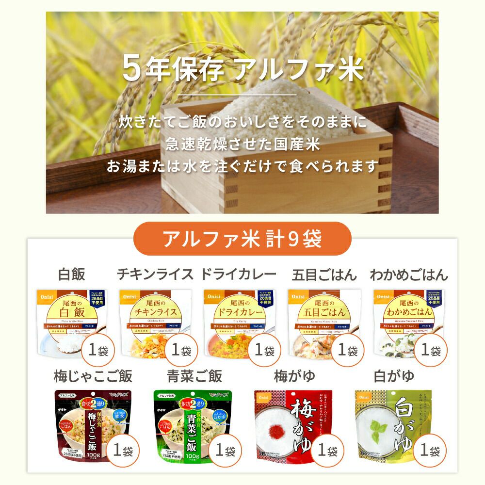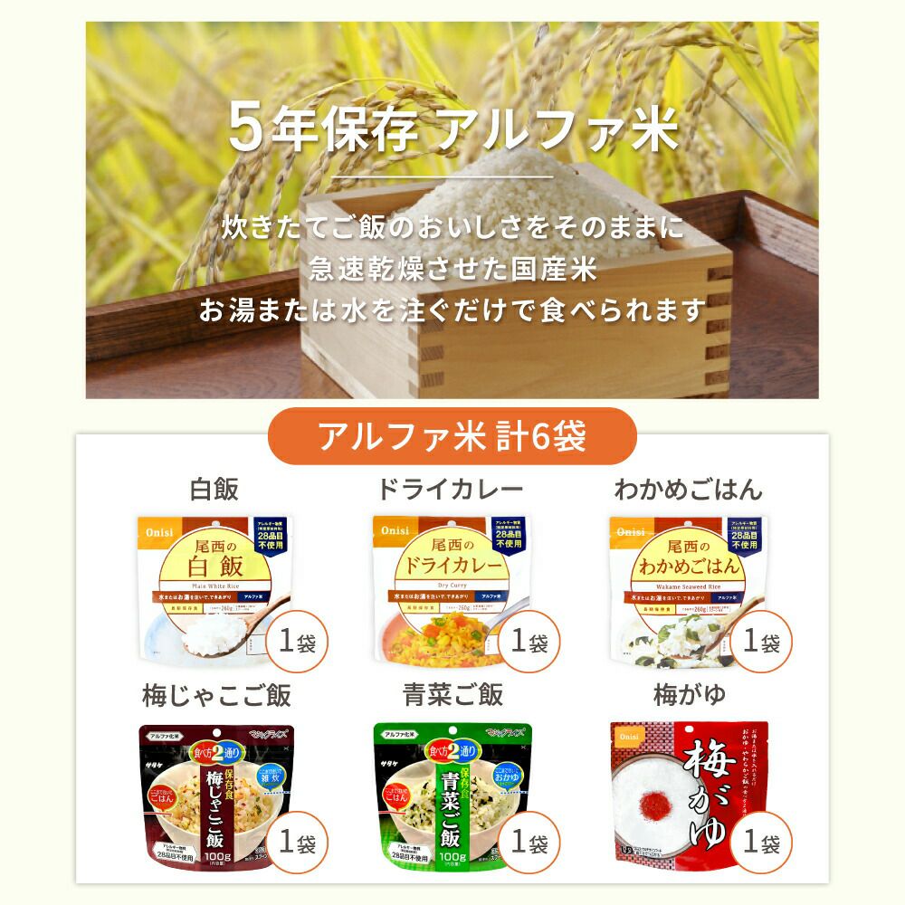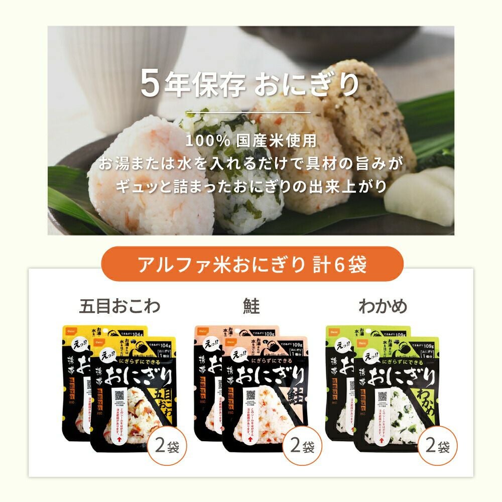 他の画像を見る 軽量、コンパクト、携帯性抜群。手を汚さずに作って食べることが出来、衛生的です。100%国産米使用 尾西の携帯おにぎり「3種類 30袋セット」 わかめ・鮭・五目おこわx各10袋 公式サイト特別価格 ¥ 7,571 税込 詳細を見る お気に入りに登録する