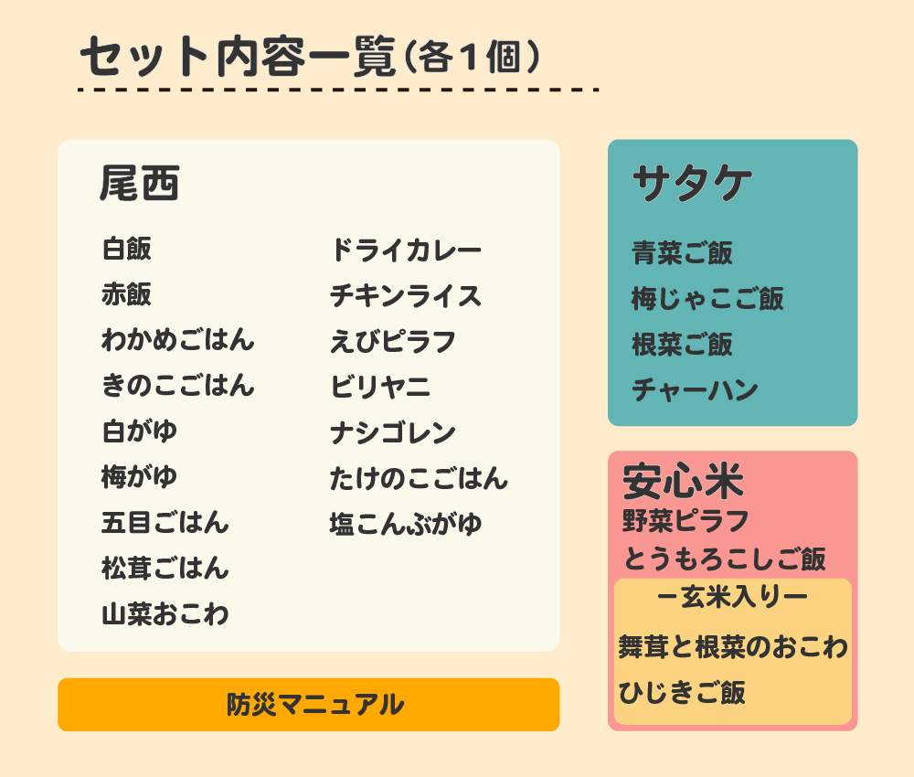 24種類すべて5年保存・違うご飯ものを揃えています。