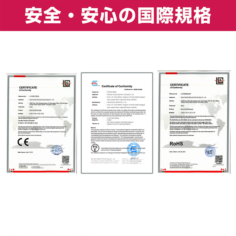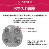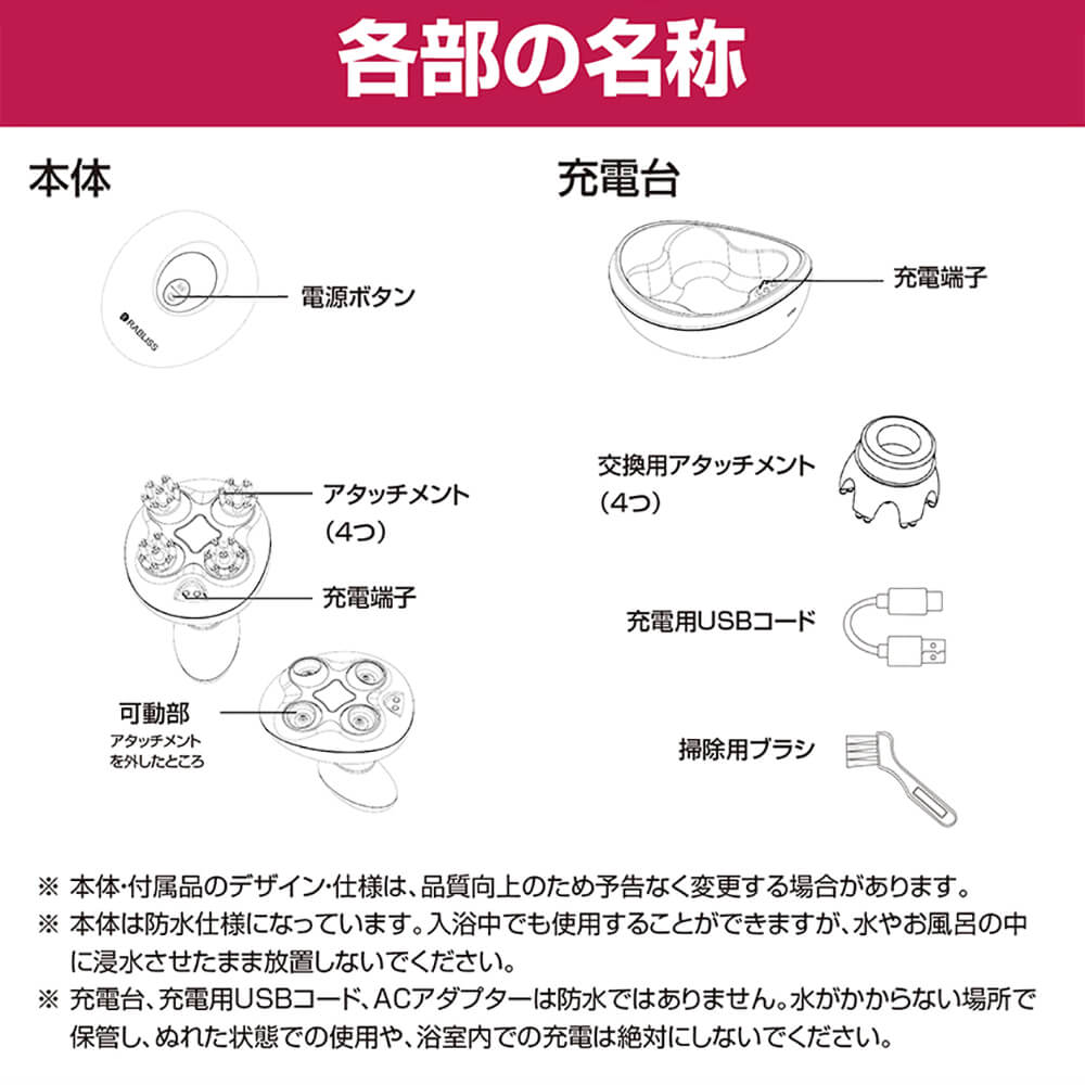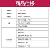 内容物:本体、電源台、充電用USBコード1本、交換用アタッチメント4個、掃除用ブラシ、取扱説明書、保証書