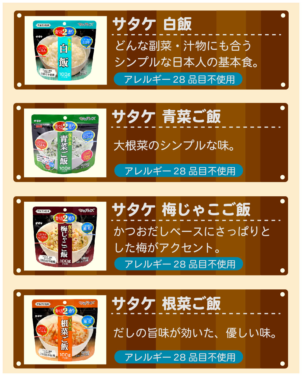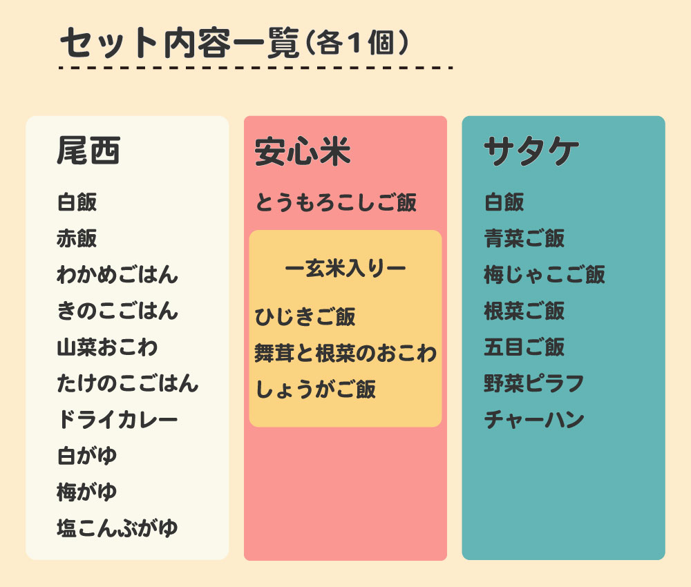アルファ米にはさまざまな種類があり、白飯・白粥などから松茸・パエリア風・えびピラフなどさまざまな味があります。