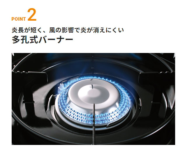 ●火足が短く、風の影響で炎が消えにくい多孔式バーナー