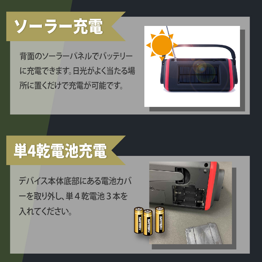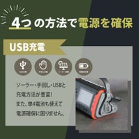 上記の照明・バッテリー・ラジオなどがありますが、それを一つに纏めた多機能防災ラジオがあり、その上軽量かつ、小さめの商品があり持ち運びもしやすく、防災リュックに入れてもスペースを取ることがありません。手回し発電(ダイナモ発電)は電池切れた上に乾電池がない場合、多機能ラジオに付いている手回し発電の機能でラジオが聞けるようになります、またソーラーパネル付きの多機能ラジオもあり、晴天時にラジオを充電することが可能です。