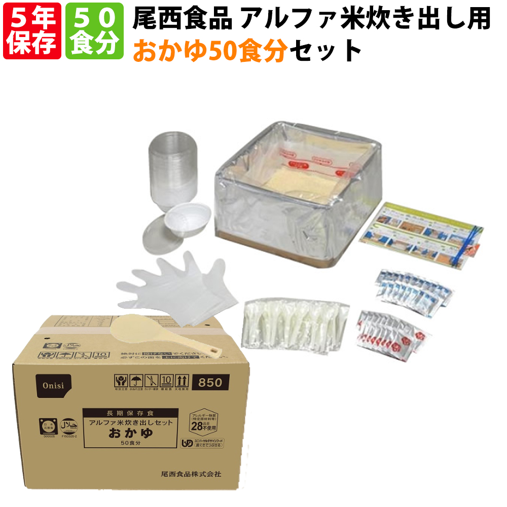 アレルギー物質(特定原材料等)27品目不使用、ハラル認証取得 尾西食品 アルファ米「炊き出し用 おかゆ 50食分セット」