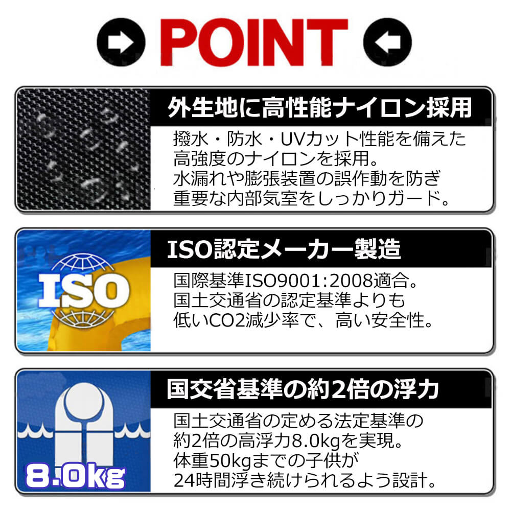 初期浮力8kg備えており、24時間後の浮力ロス率もわずか5%以下。
