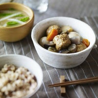 名古屋コーチン入りの味わい深いつくねと、存在感のあるたけのこ、にんじん、ごぼう、さといもなどのお野菜を白出汁でやさしい味に仕上げました。