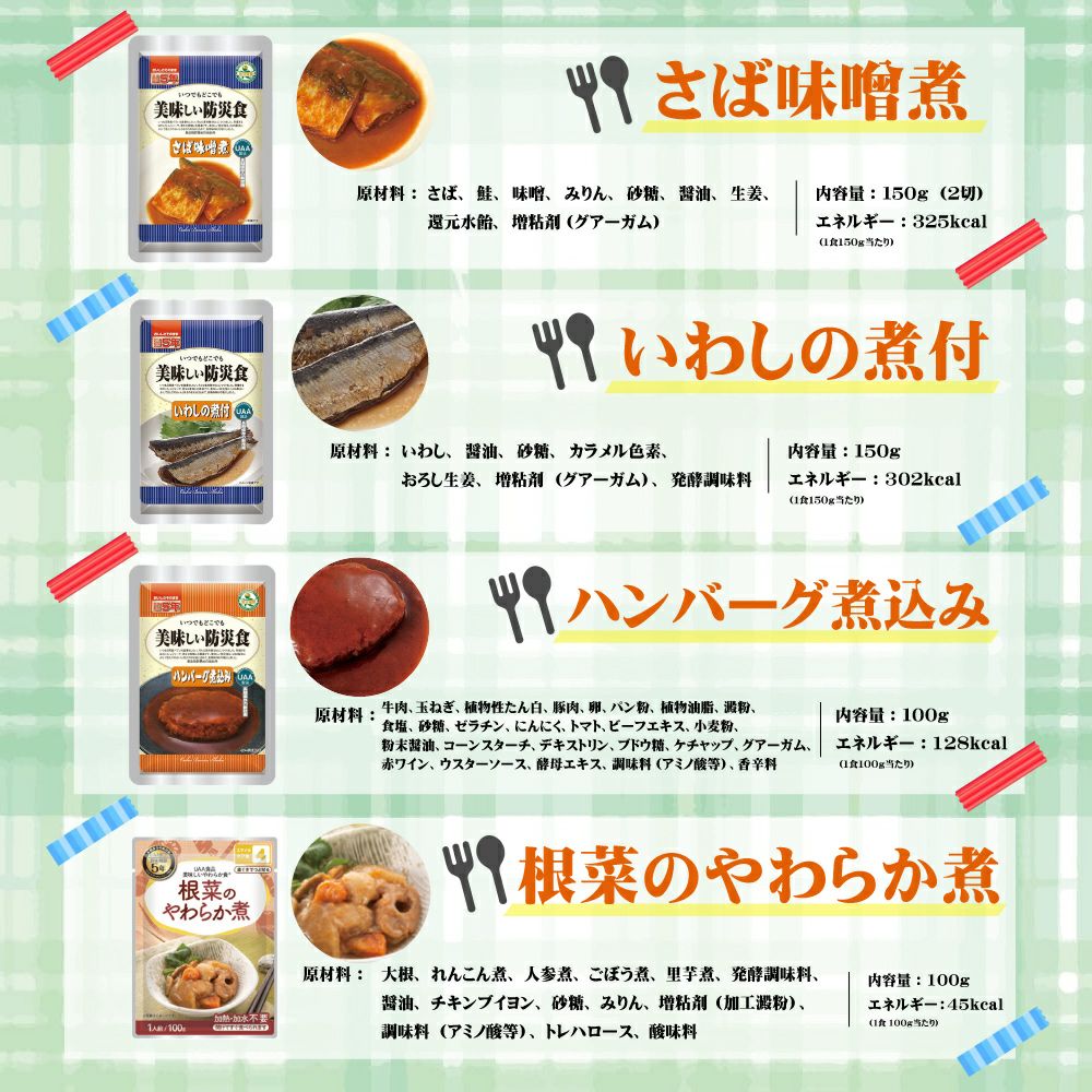 他の画像を見る ハンバーグ さば/いわし/赤魚の煮付 筑前煮 肉じゃが かぼちゃ/鶏と野菜煮 豚汁 牛丼 きんぴら さつま芋 金時豆 ミートボール おでん ハンバーグ煮込みトマトソース 非常食セット 美味しい防災食 「おかず・お惣菜 充実の16種類セット」 公式サイト特別価格 ¥ 8,094 税込 詳細を見る お気に入りに登録する