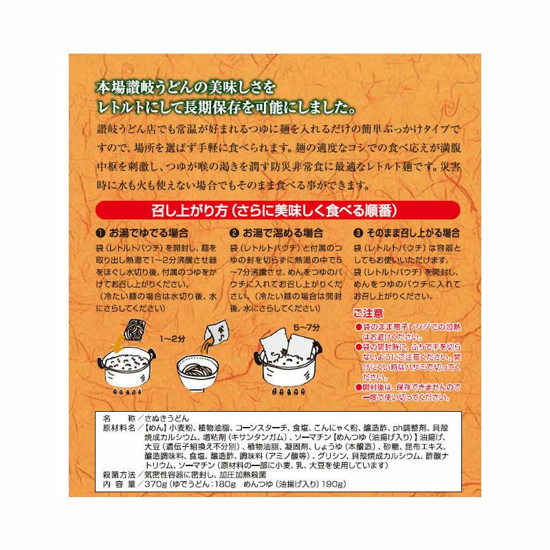 他の画像を見る つゆに麺を入れるだけ!器も火も水も不要!割り箸付き。温めてさらに美味しく! 非常食5年保存食讃岐うどん【10食セット】本場香川県の揚げ入りさぬきうどん 公式サイト特別価格 ¥ 7,900 税込 詳細を見る お気に入りに登録する