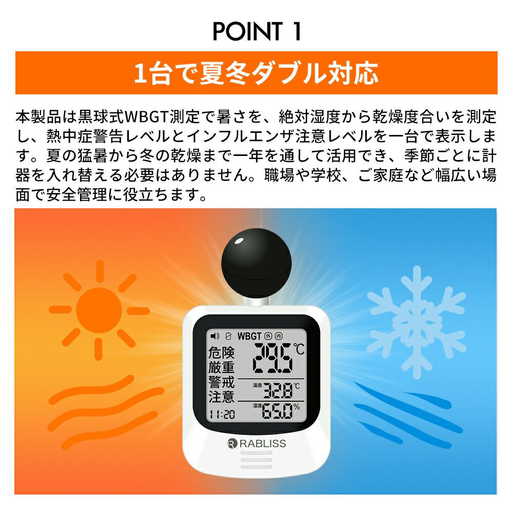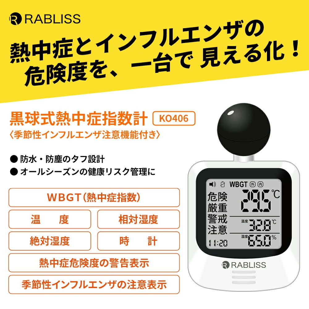 他の画像を見る 黒球式WBGT計で熱中症リスクを可視化、絶対湿度でインフルエンザ注意をお知らせ。 熱中症対策 黒球式熱中症指数計 2個 インフルエンザ注意機能 感染症対策 絶対湿度 WBGT 黒球式 JIS準拠 IP65 防塵防水 KO406 RABLISS 公式サイト特別価格 ¥ 10,241 税込 詳細を見る お気に入りに登録する