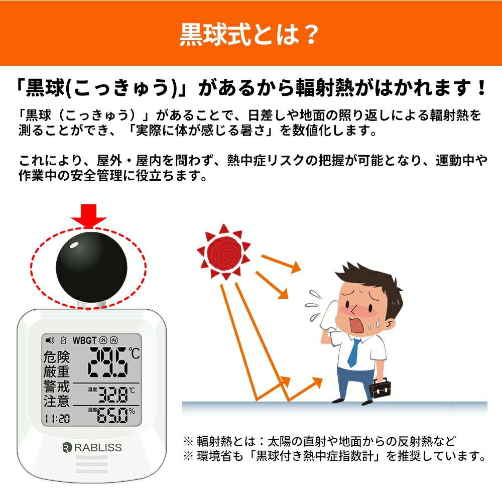 他の画像を見る 暑さの見える化で熱中症を防ぐ 黒球式WBGT計で屋内外の暑熱リスクを正確に把握 温度 湿度 熱中症危険度の警告表示 熱中症対策 黒球式 熱中症指数計 2個 WBGT 暑さ指数 JIS準拠 熱中症計 熱中症対策グッズ 義務化対応 アラーム機能 コンパクト KO392 RABLISS 公式サイト特別価格 ¥ 5,594 税込 詳細を見る お気に入りに登録する