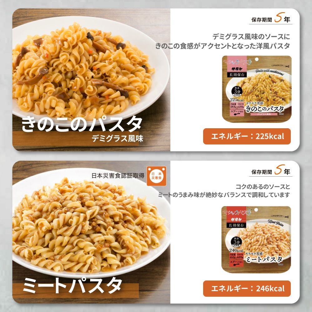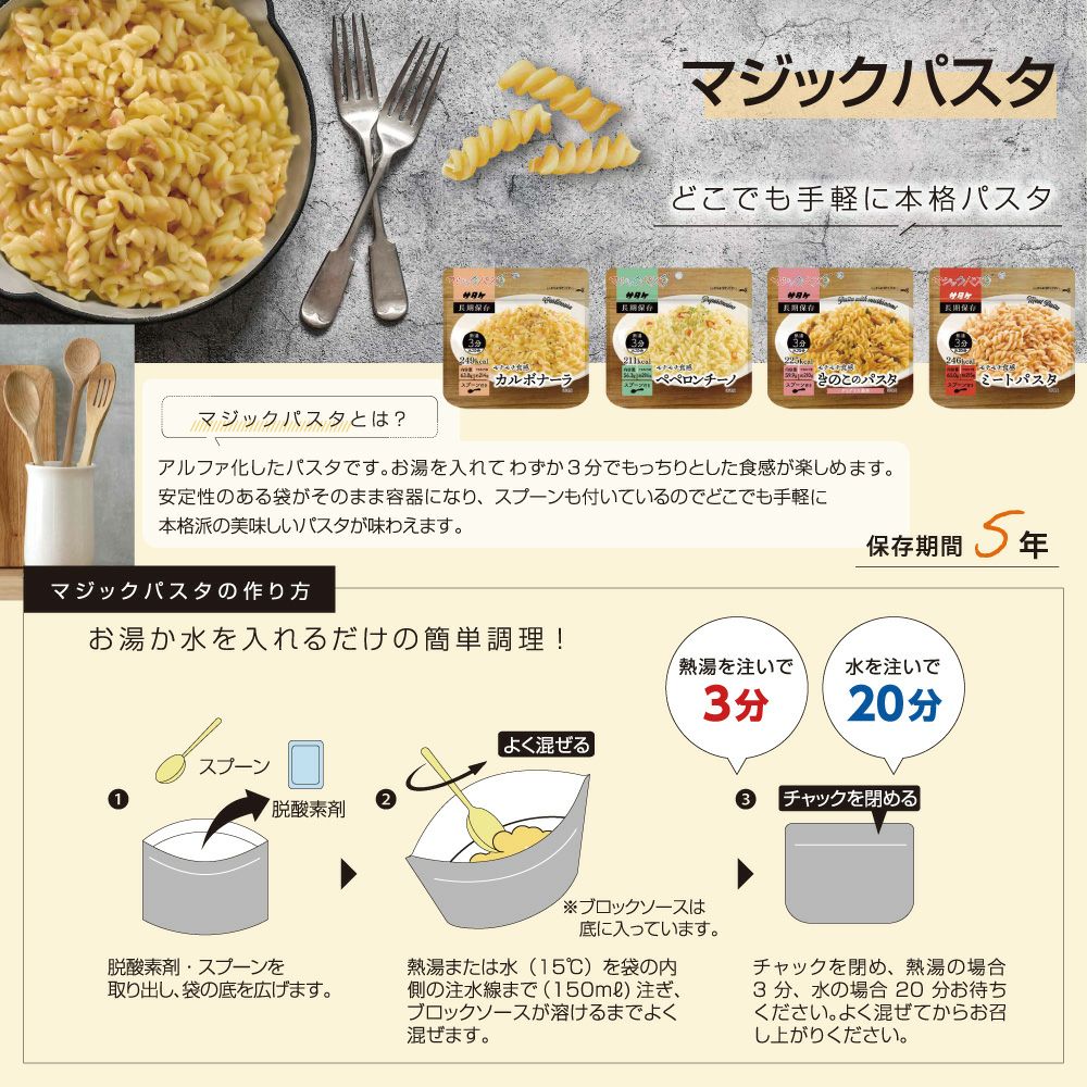 他の画像を見る 非常食・アウトドア・海外旅行に最適!お湯か水を適量加えるだけ 非常食 マジックパスタ ミートパスタ 20食 5年保存 備蓄 防災食 主食 防災グッズ 防災用品 サタケ 公式サイト特別価格 ¥ 8,331 税込 詳細を見る お気に入りに登録する