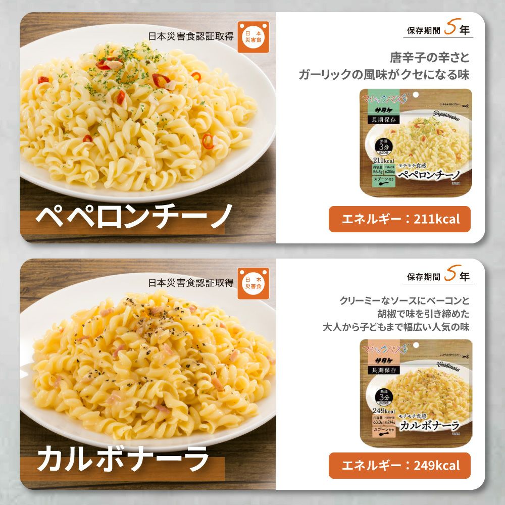 他の画像を見る 非常食・アウトドア・海外旅行に最適!お湯か水を適量加えるだけ 非常食 マジックパスタ 20食 4種類 カルボナーラ ペペロンチーノ きのこのパスタ ミートパスタ 防災グッズ 5年保存 長期保存 防災食 非常食セット 災害 サタケ 公式サイト特別価格 ¥ 8,331 税込 詳細を見る お気に入りに登録する